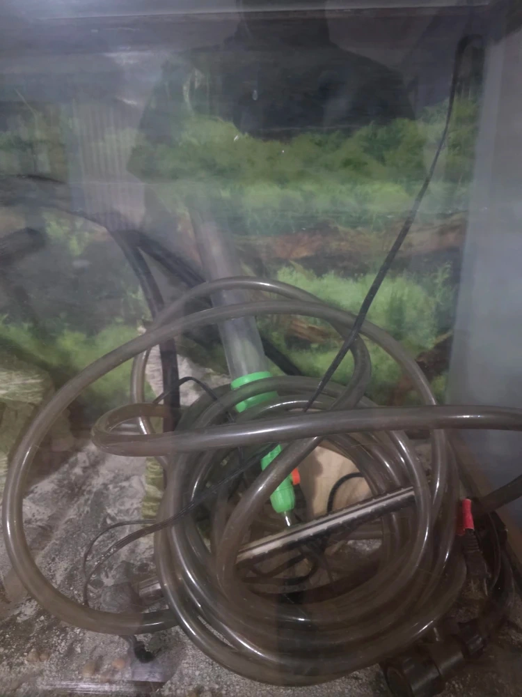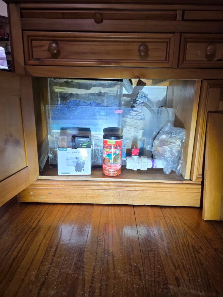 Selling a complete fish tank setup! It comes with the tank, a wooden stand with storage, and various accessories. I've included a filter, heater, and some decorations. Everything you need to get started with your own aquarium!