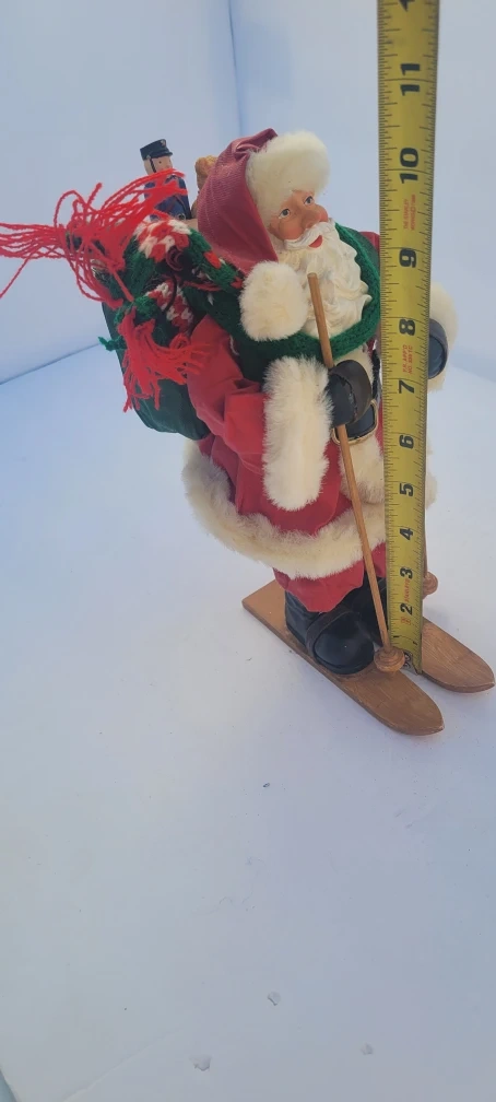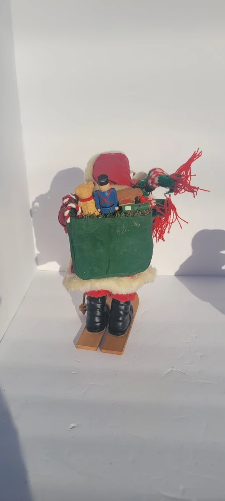 This is a cute Santa Claus figurine on skis! He's wearing a red suit with white fur trim and carrying a green bag full of toys. He would make a great addition to your holiday decor