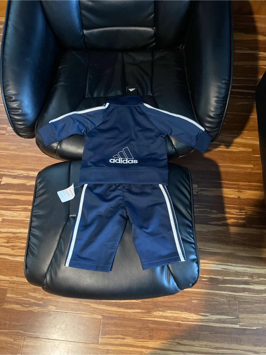 Selling a cute Adidas baby tracksuit in navy blue! It includes a zip-up jacket and matching pants , perfect for your little one. The classic Adidas stripes add a sporty touch. Great for playtime or outings!