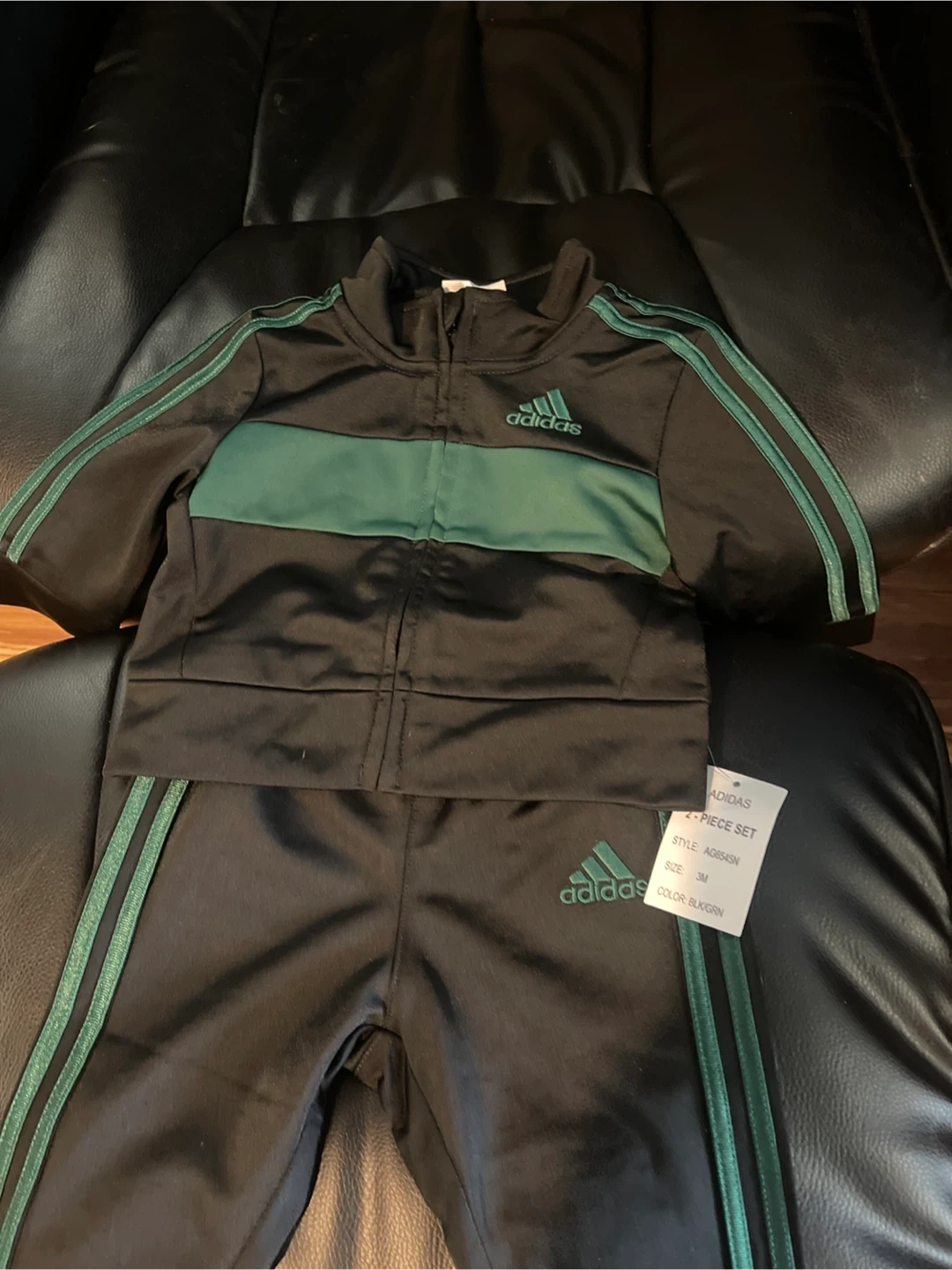 Selling an adorable Adidas 2-piece set! It features a jacket and pants with stylish green stripes on a black background. The set is size 3M and in great condition!