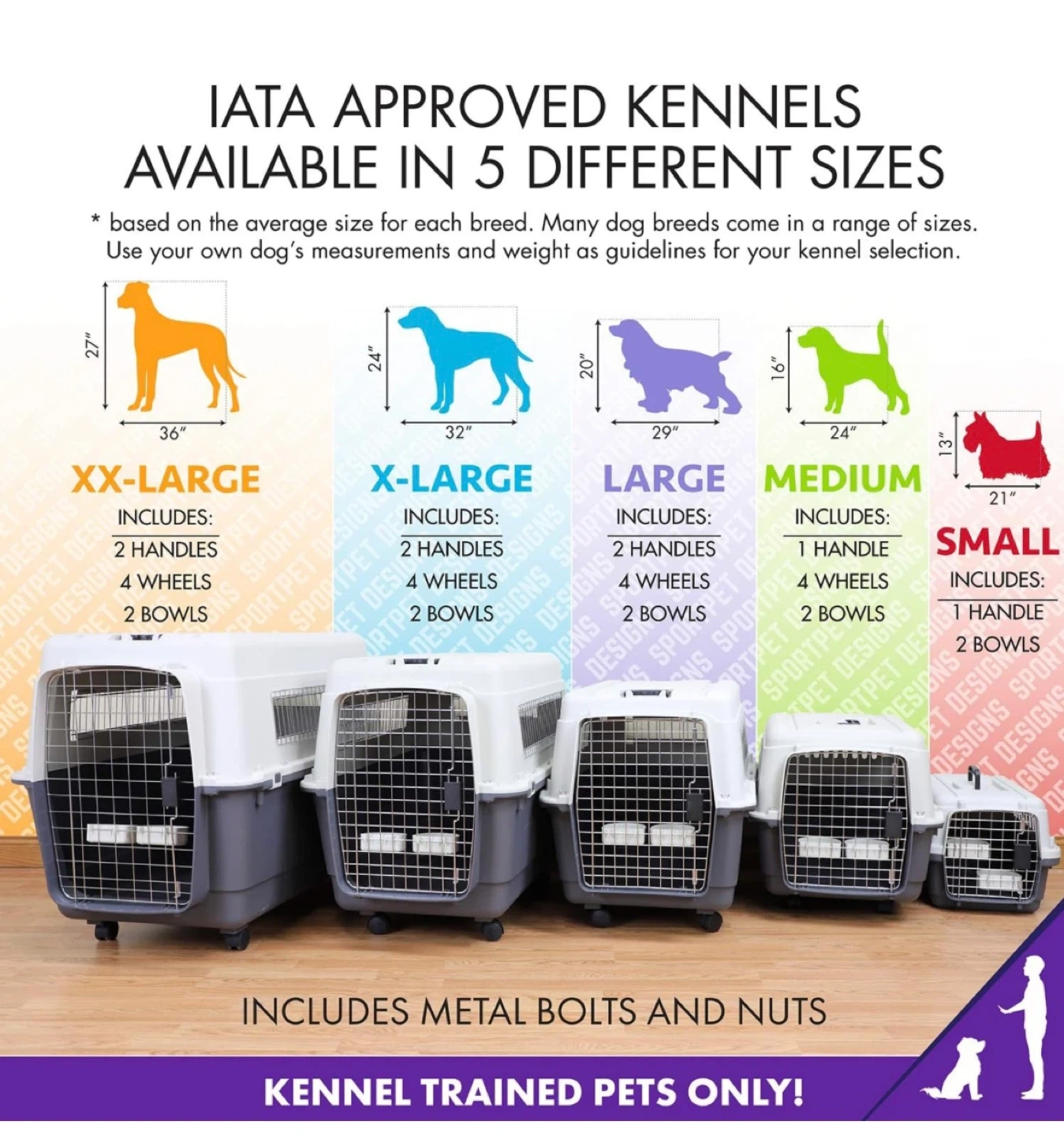 The kennel meets air travel requirements. Easy to assemble. 90-125 lbs.