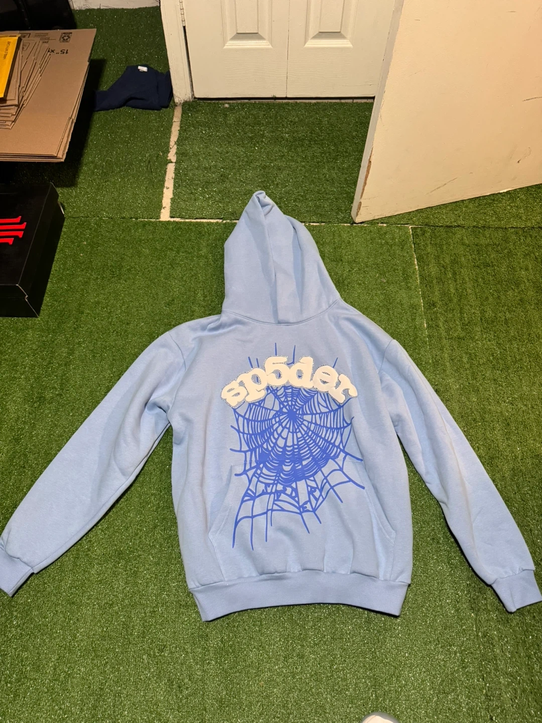 Selling a light blue Sp5der hoodie in size large. The hoodie features a spiderweb design on the back. It's in great condition and ready for a new owner!