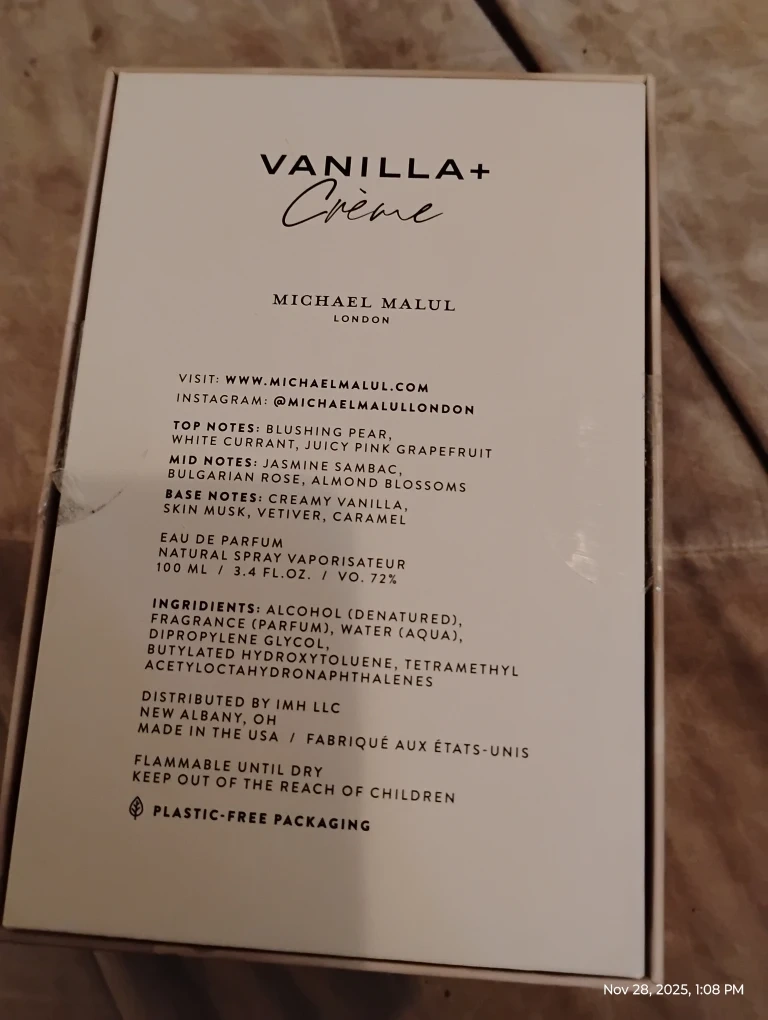 Selling a bottle of Michael Malul Vanilla+ Crème Eau de Parfum. It's a natural spray vaporisateur, and the bottle contains 100 ml / 3.4 fl.oz.