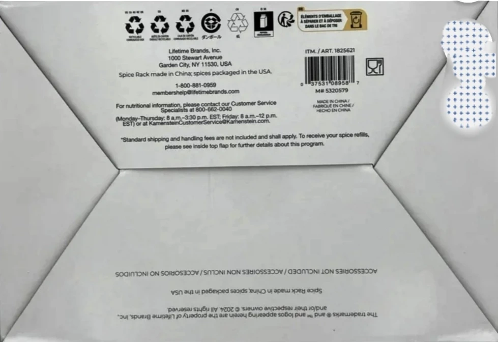 It features a removable shaker disc on every jar, perfect for filling or using with measuring spoons. Spices are included, and you also get free 5-year spice refills! The spice rack is made in China, and the spices are packaged in the USA.