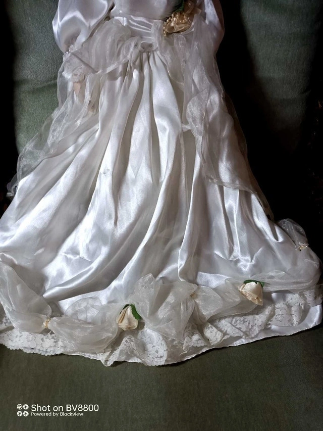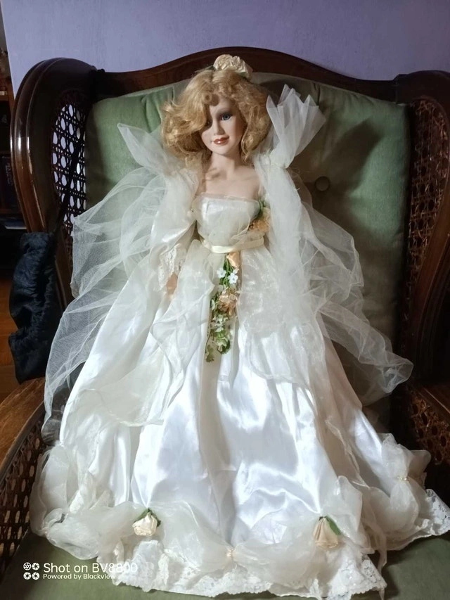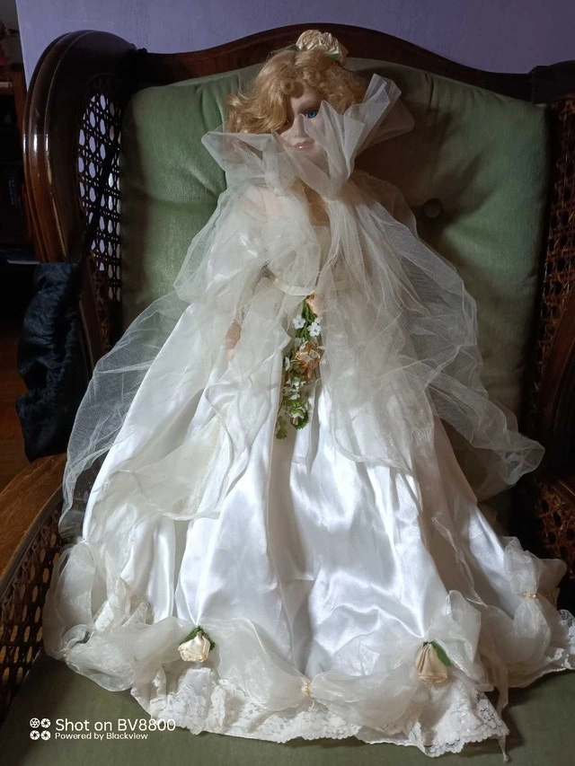 This elegant porcelain doll, dressed in a detailed white gown, stands as a beautiful collectible in good condition. While it's been previously loved, it retains its charm and makes a delightful addition to any doll collection. Here are some additional features: * Intricate gown detailing * Porcelain construction * Collectible item Priced to sell at $60. This Doll is 24 inches tall. Just a heads-up – if this ad is still up, the doll is still available for a new home!