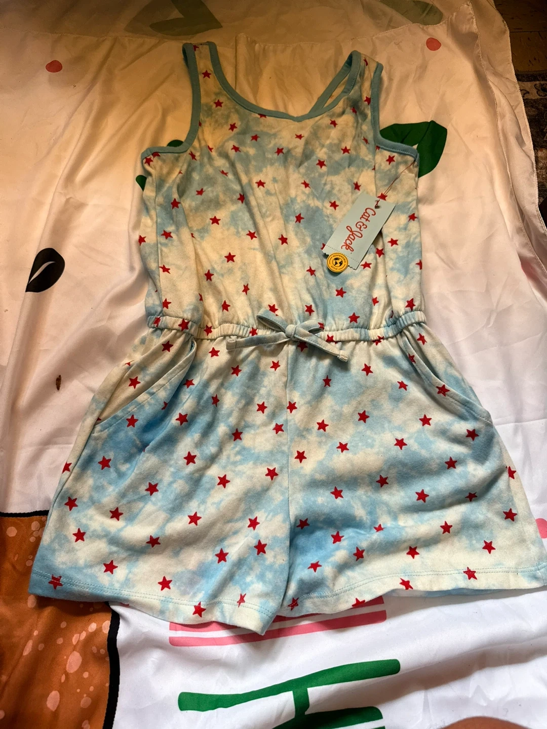 This adorable romper from Cat & Jack features a fun blue and white tie-dye pattern with red stars! It's in great condition and ready for a new owner. Perfect for warm weather!