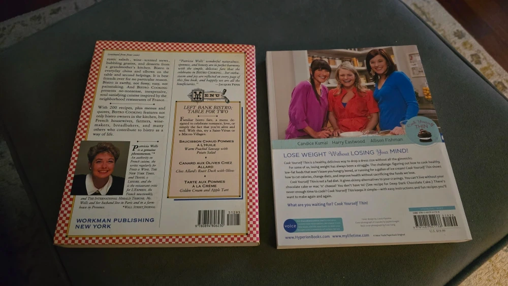 Selling two cookbooks: Patricia Wells' 'Bistro Cooking' and 'Cook Yourself Thin'. Both books are filled with delicious recipes and great cooking inspiration for anyone who loves to cook or wants to try new things in the kitchen