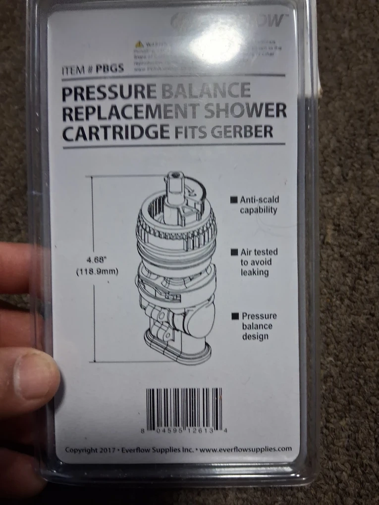 Selling a new Everflow pressure balance replacement shower cartridge that fits Gerber. It has anti-scald capability and a pressure balance design. It's also air tested to avoid leaking. The cartridge measures 4.68 inches (118.9mm).