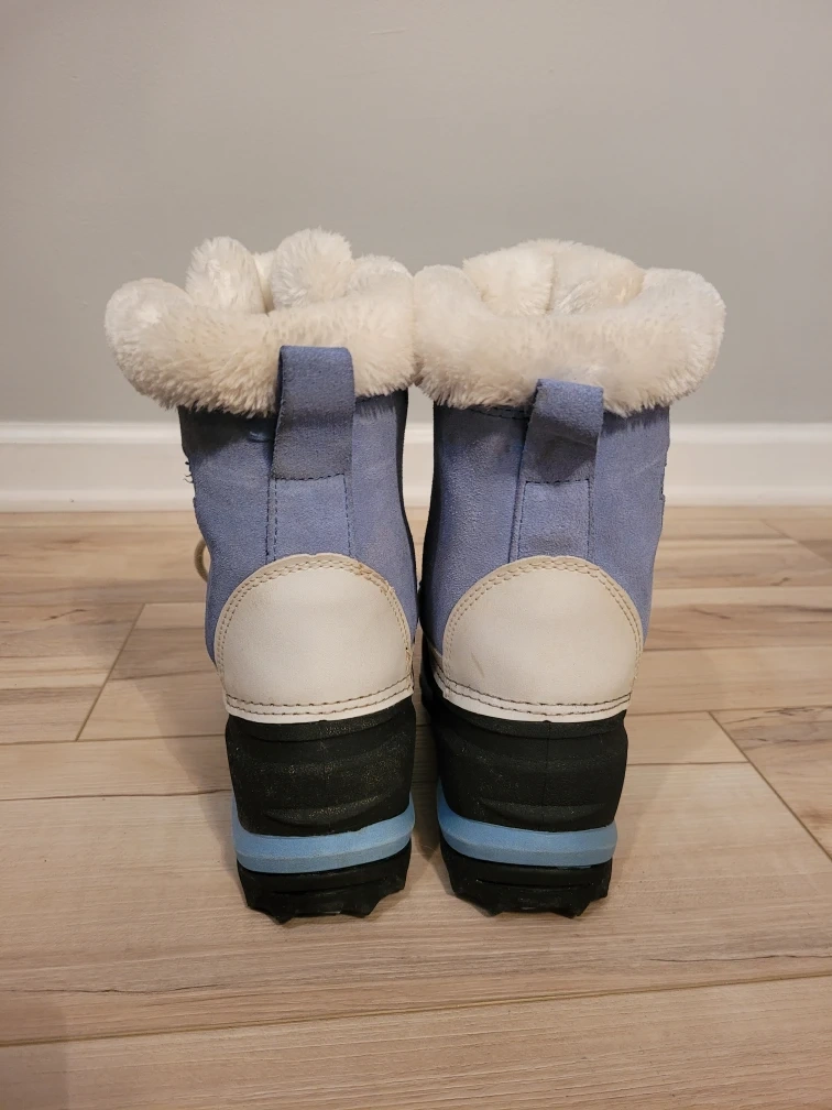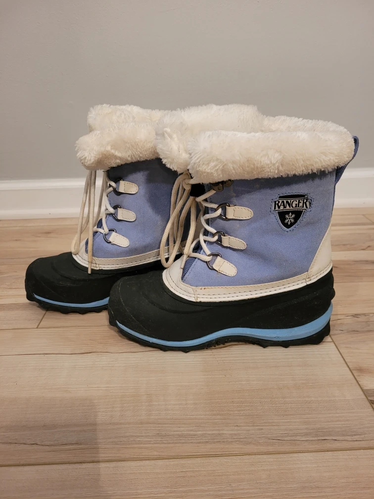 Girls size 2 winter boots lined with Thermolite, a recycled lightweight textile designed to deliver warmth. These Ranger snow boots are perfect for keeping feet warm and dry this winter! They feature a blue and white design with a fur trim. They are in good condition and traction but do show some dirt throughout see photos for condition.