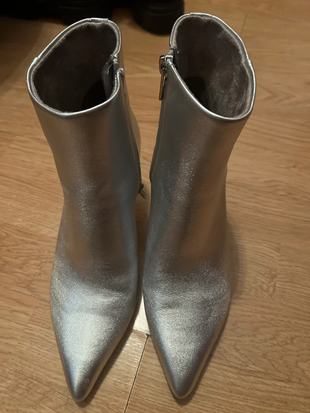 Selling a pair of silver ankle boots. They are in great condition and ready for a new owner! The boots have a stylish design and would be a great addition to your wardrobe and for the holiday season