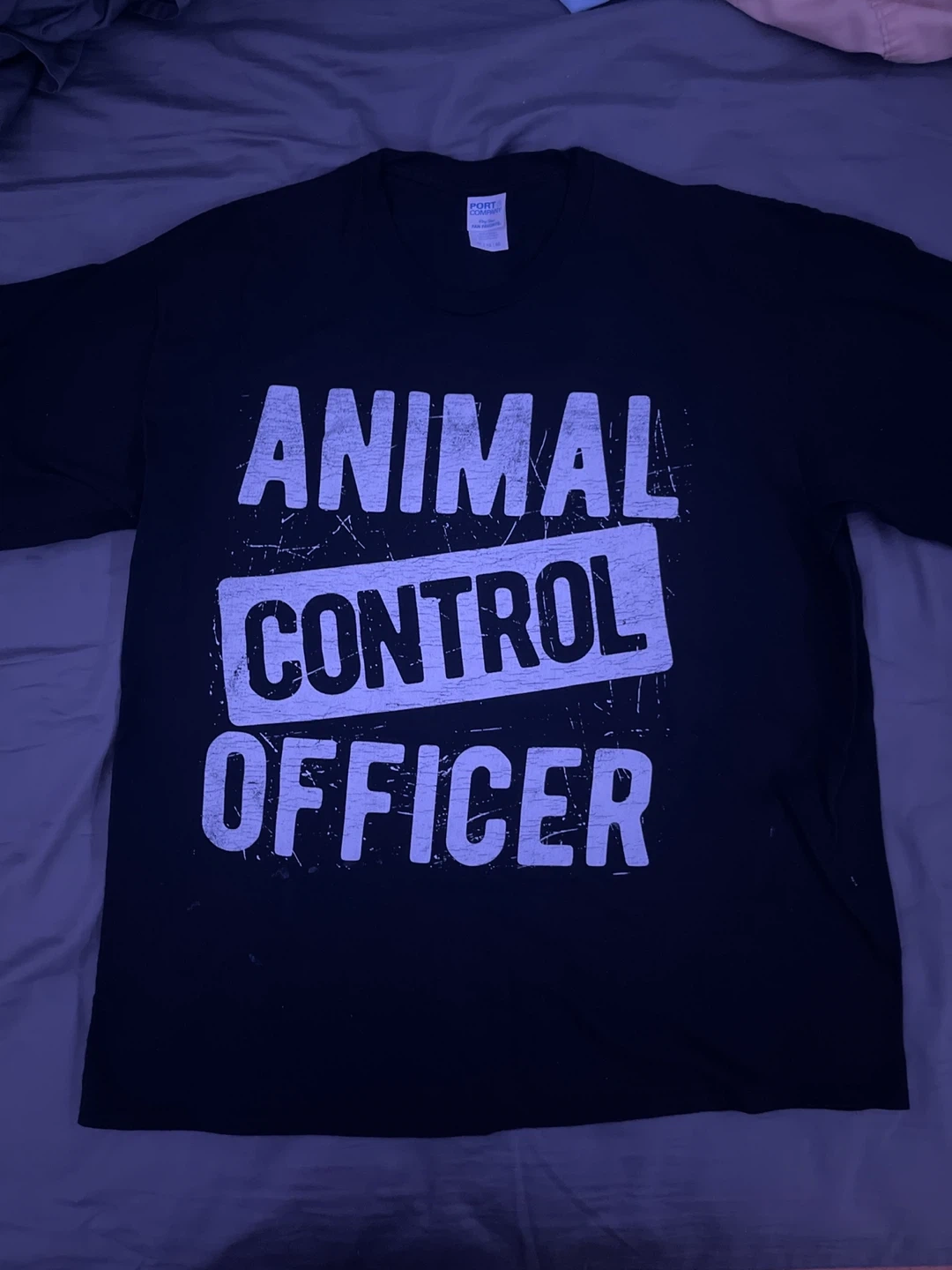 I'm selling a t-shirt that says "Animal Control Officer" on it. The brand is Port & Company. It's black in color.