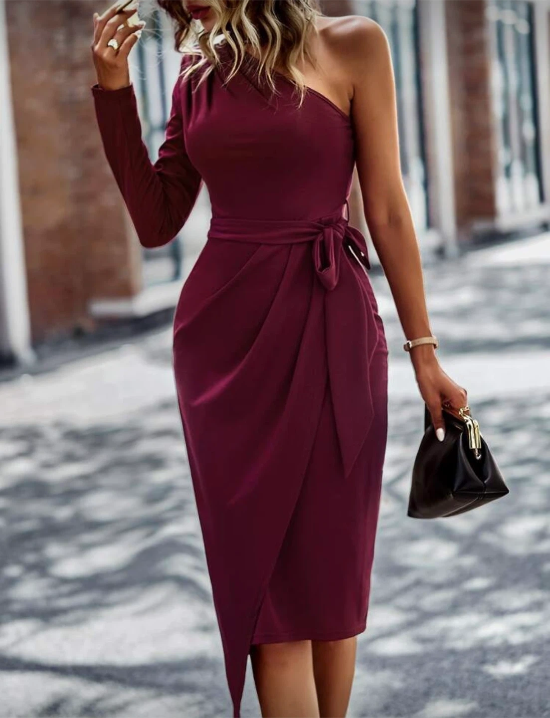 Large Sexy red Christmas Burgundy One shoulder long sleeve Dress