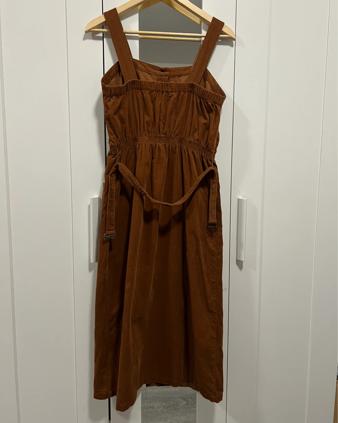 Size medium UO button down corduroy dress in a rich light brown colour. The waist is elasticized and it has a belt too. The straps are adjustable in length and can also be crossed if you prefer. Comes to about mid calf on me, I’m 5’3”. Worn only once or twice!