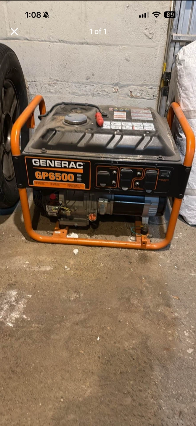 Selling a Generac GP6500 portable generator. It has an orange frame and is perfect for backup power during outages or for outdoor projects. It's a reliable generator that's ready to use!