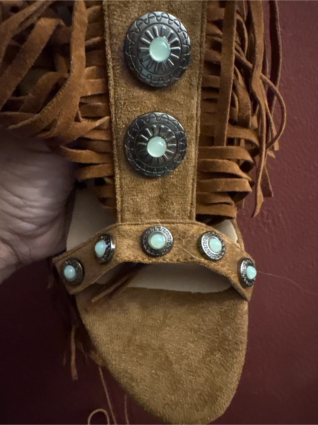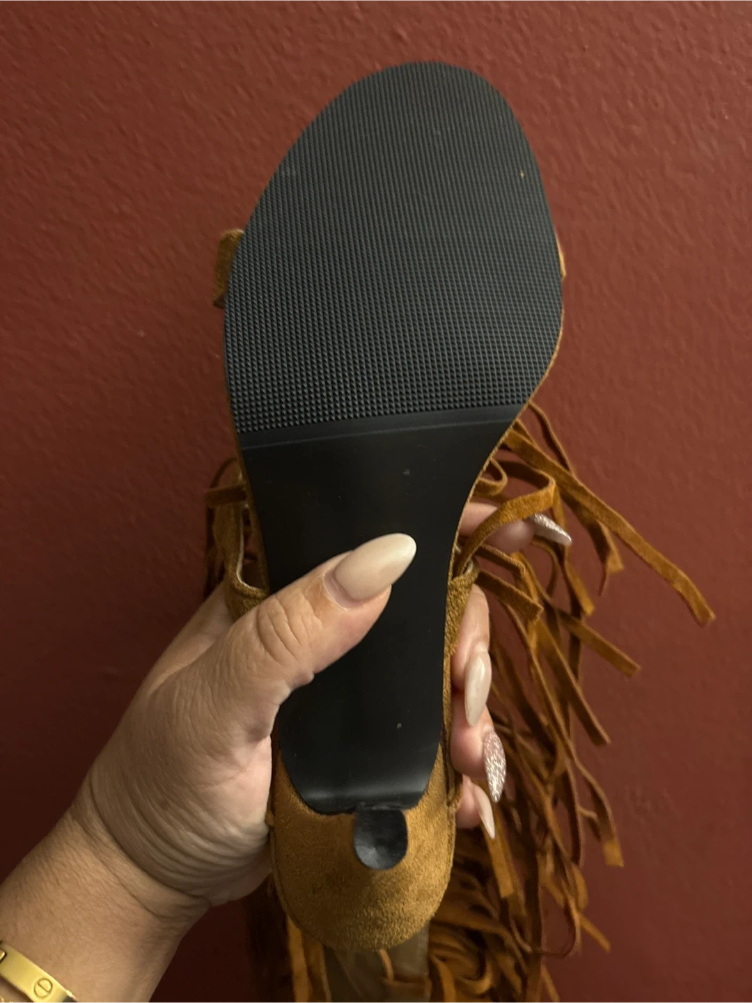 Stylish Suede fringe heeled sandals in size 8 8.5 These unique sandals feature a suede-like material and decorative silver accents. Perfect for adding a bohemian touch to your outfit! NEW