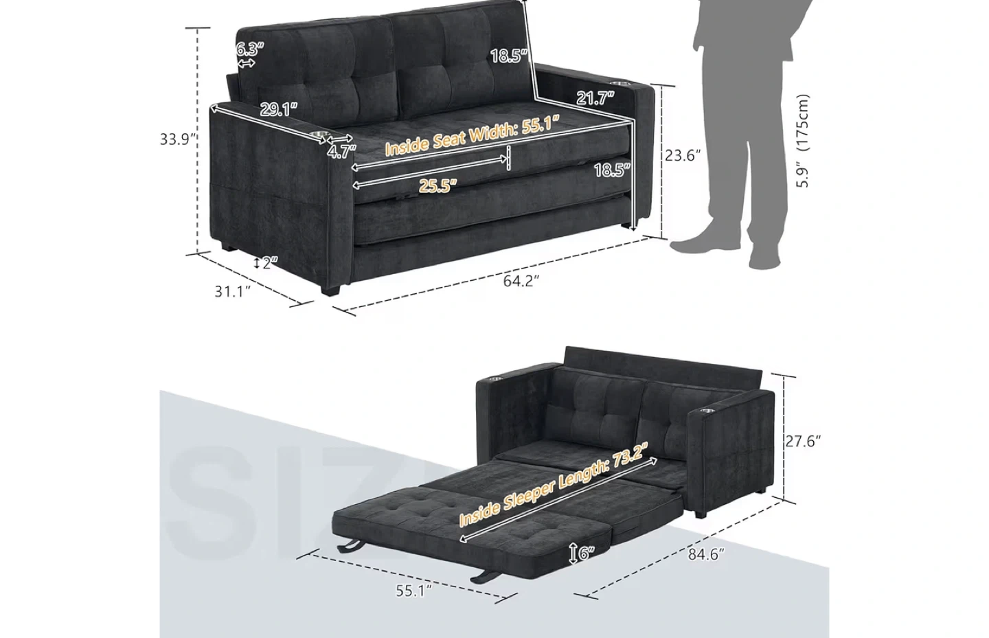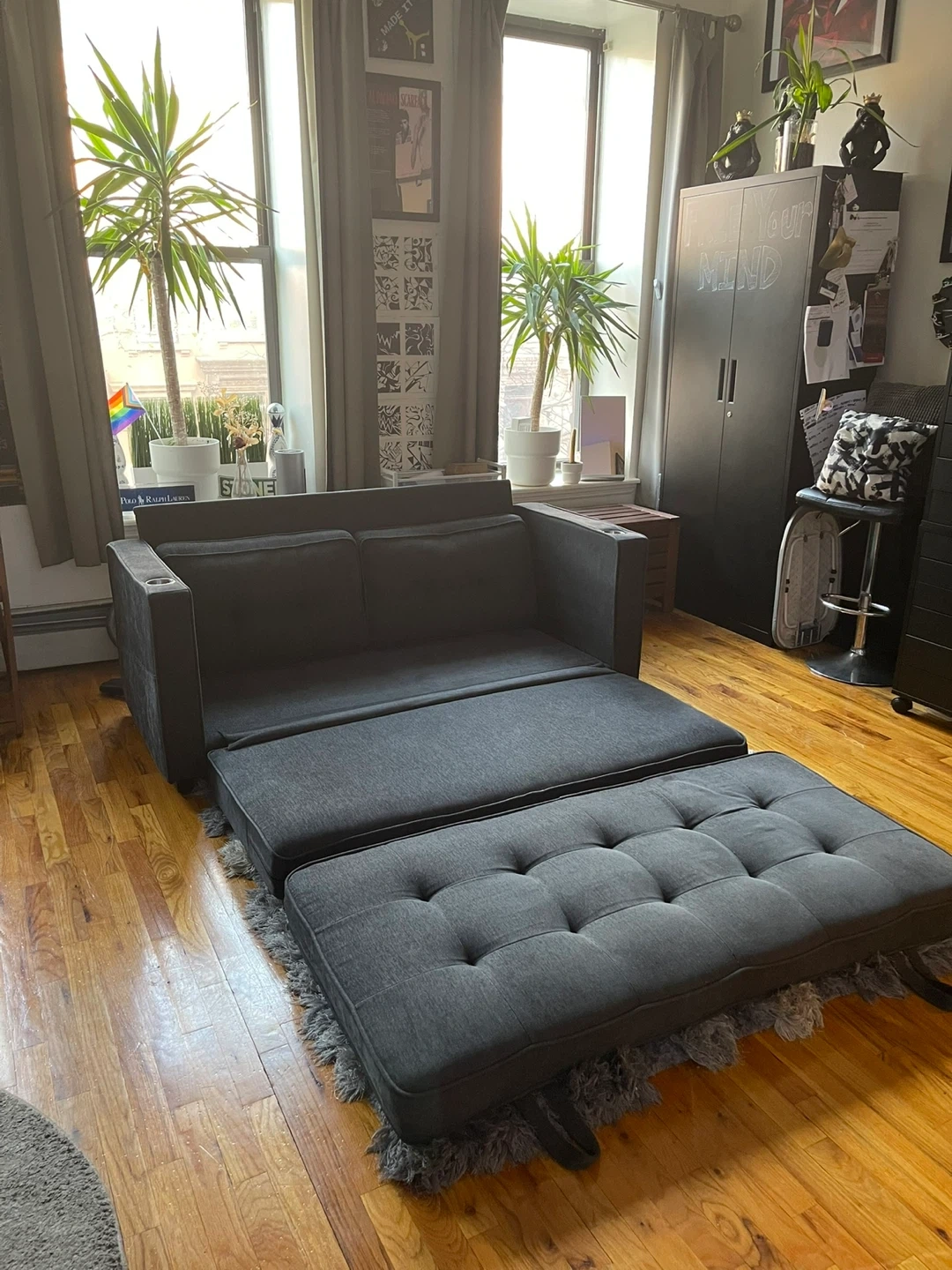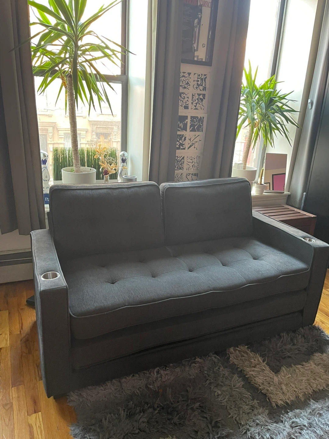 Selling a comfy gray sleeper sofa. It's in great shape and perfect for a living room or guest room. The sofa has built-in cup holders on the sides, which is super convenient!