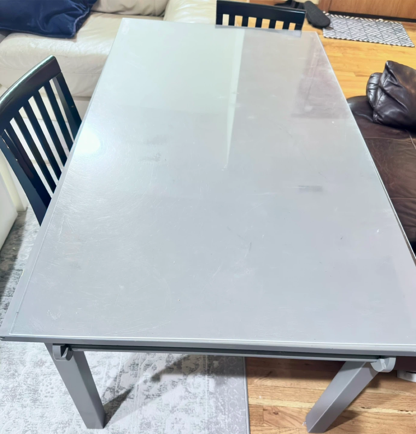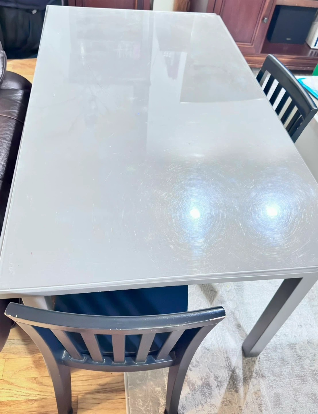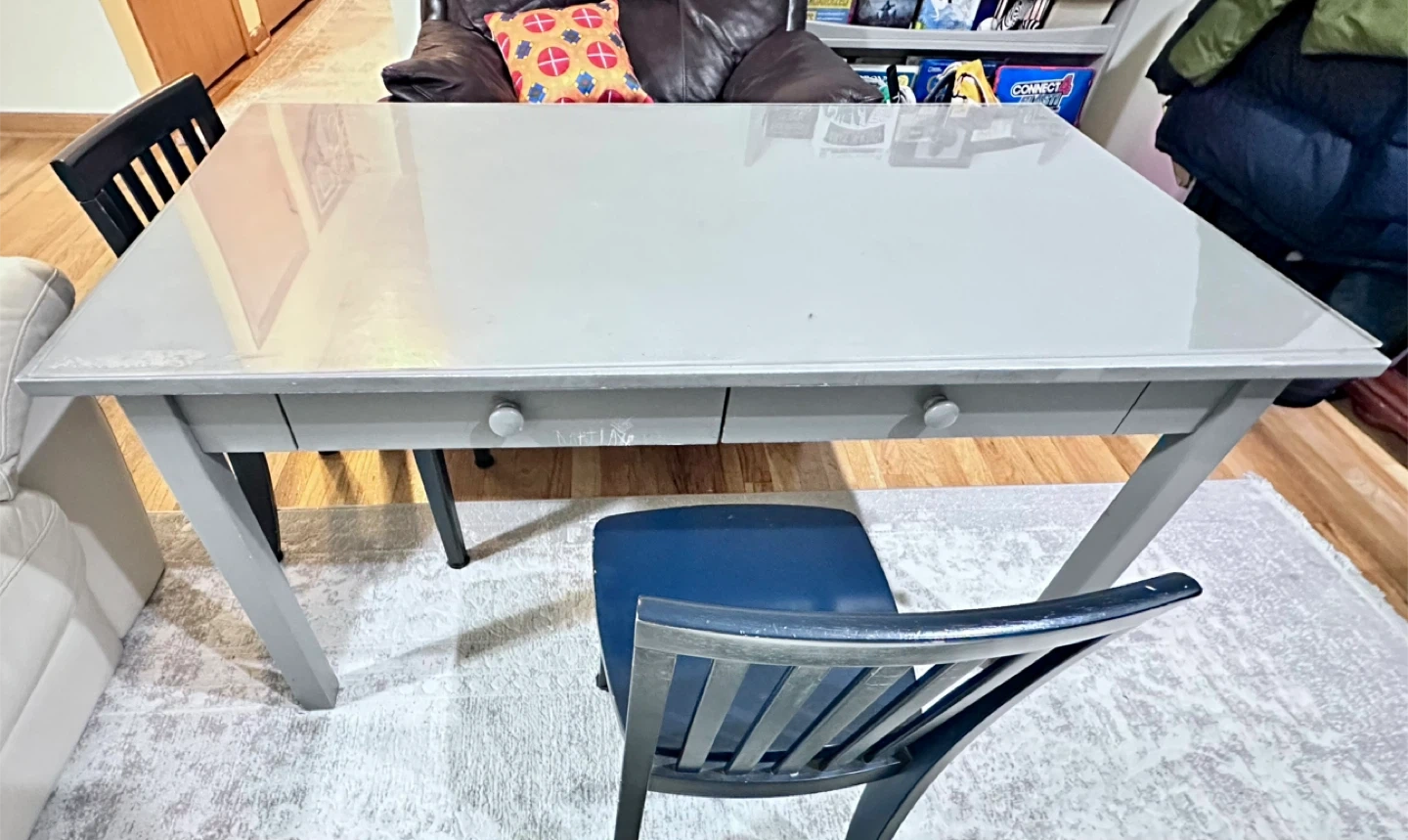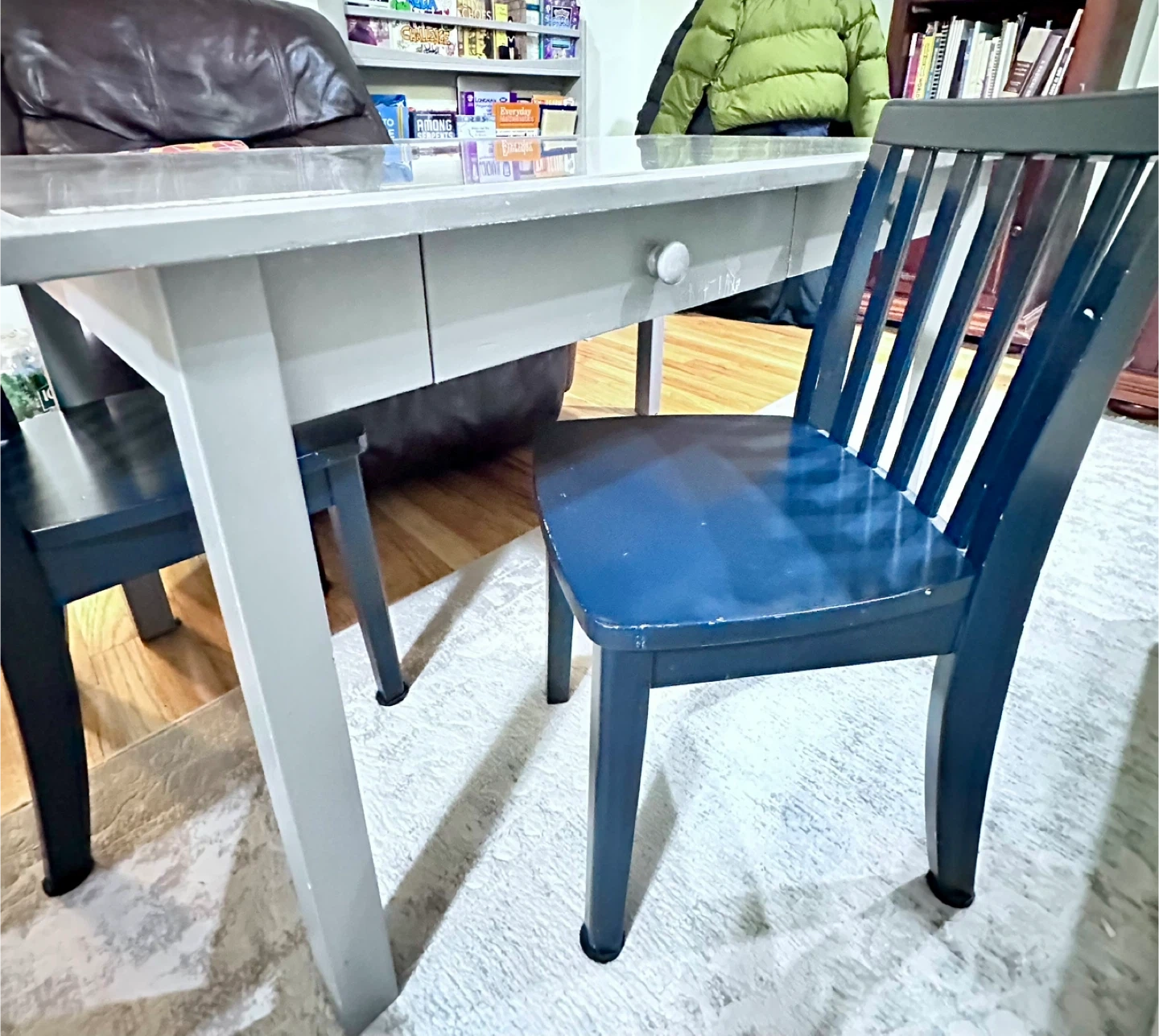 Pottery Barn Kids Carolina Desk in gray (47” × 24”), extremely sturdy and very well-maintained. The desk offers a spacious work area ideal for homework, reading, art projects, and everyday use. Bundle includes two durable blue chairs and an acrylic surface desk mat that protects the top and makes cleaning easy. All pieces are in excellent condition with only minimal, normal use. High-quality set from a smoke-free, pet-free home.