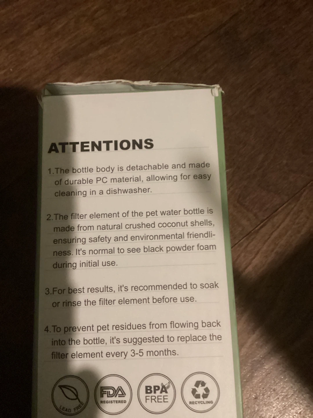 I'm selling a brand new 3 in 1 pet water bottle. It has a 600ml large capacity and is perfect for outdoor essentials. The bottle body is detachable and made of durable PC material, allowing for easy cleaning in a dishwasher. The filter element of the pet water bottle is made from natural crushed coconut shells, ensuring safety and environmental friendliness. It's normal to see black powder foam during initial use. For best results, it's recommended to soak or rinse the filter element before use. To prevent pet residues from flowing back into the bottle, it's suggested to replace the filter element every 3-5 months. The box is included!