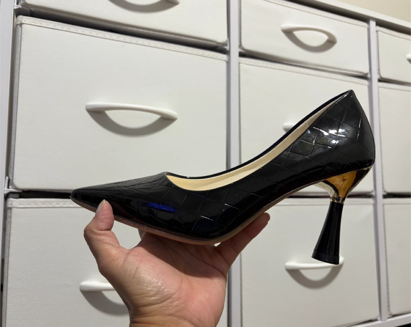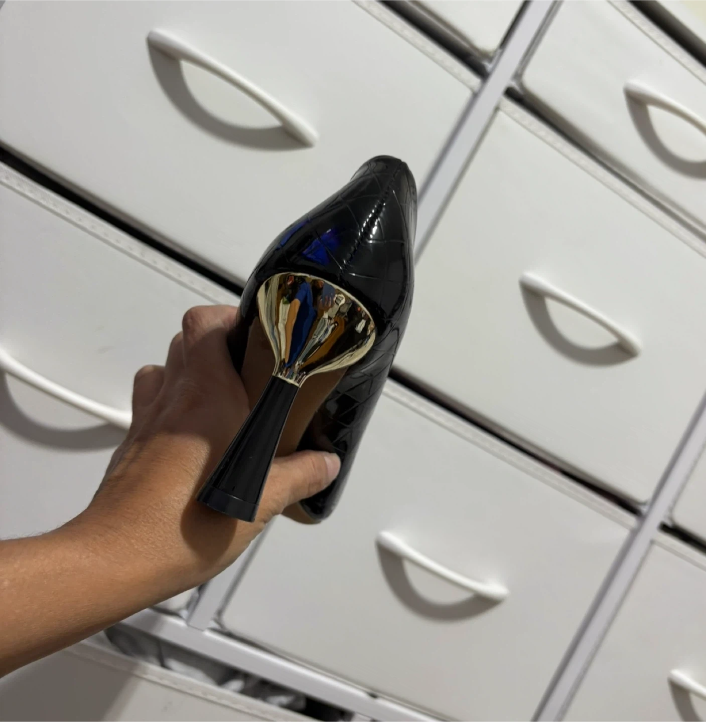 Selling a pair of Leguanitos heels in black patent leather! These are a unique style with a gold and black heel. They're in great condition and ready for a new owner