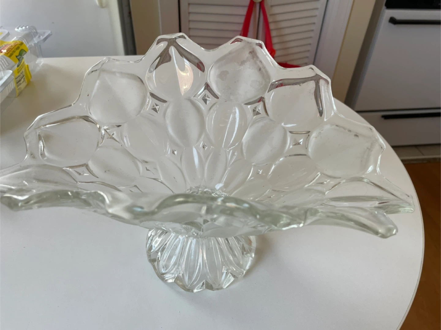 Selling a lovely clear glass decorative bowl! It's in great condition and would look beautiful as a centerpiece or fruit bowl. The design features a unique petal-like edge with a raised base. Perfect for adding a touch of elegance to your home