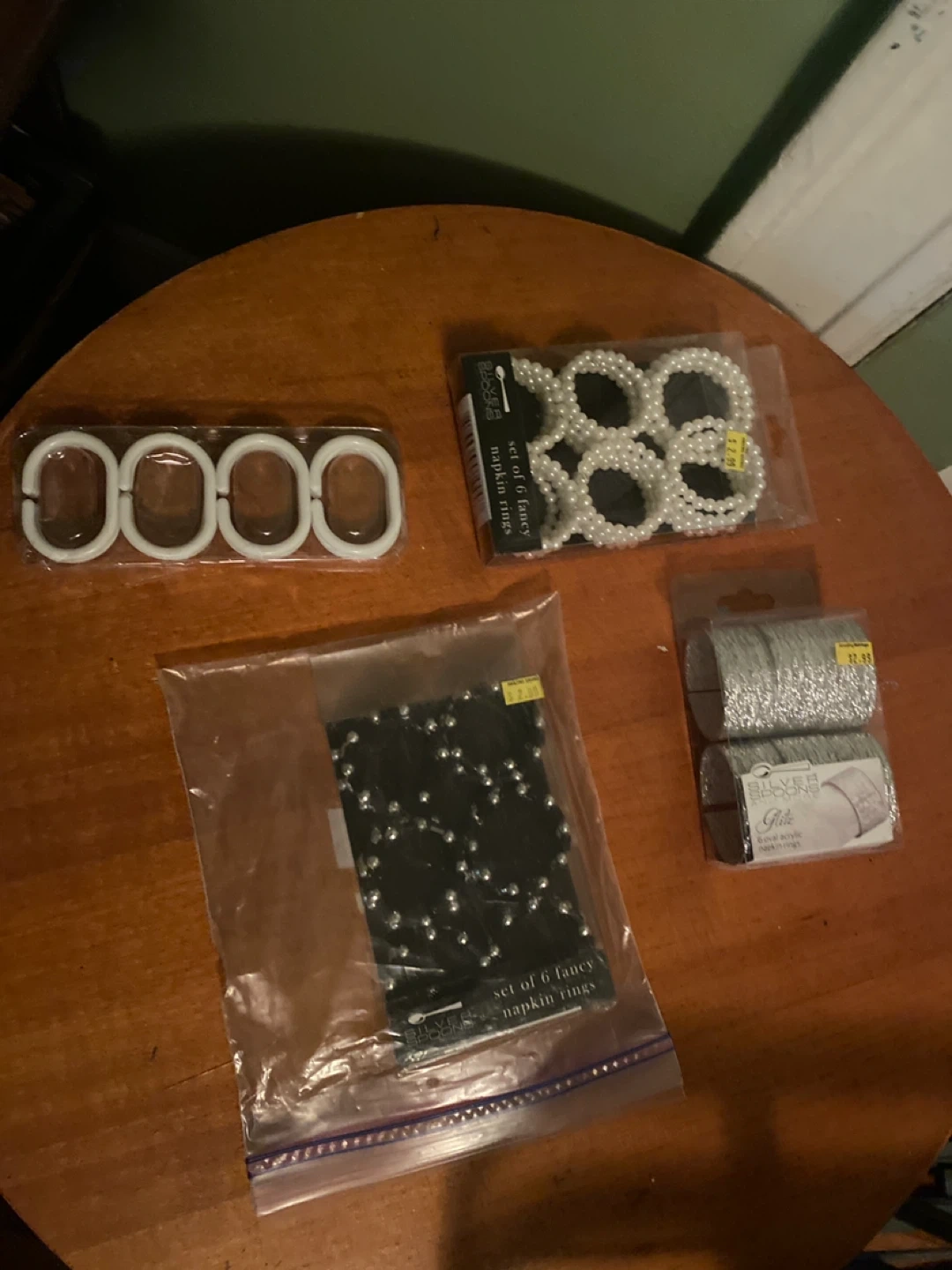 Selling a set of napkin rings and shower curtain hooks.