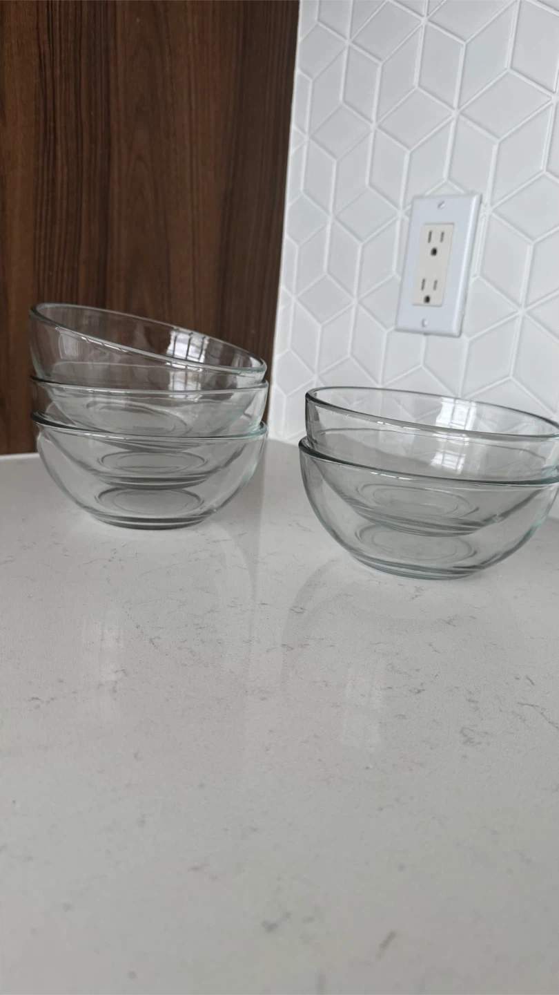 Selling a set of glass bowls, perfect for everyday use. They are in great condition and ready for a new home. These bowls are versatile and can be used for serving, mixing, or storing food. They're a great addition to any kitchen!