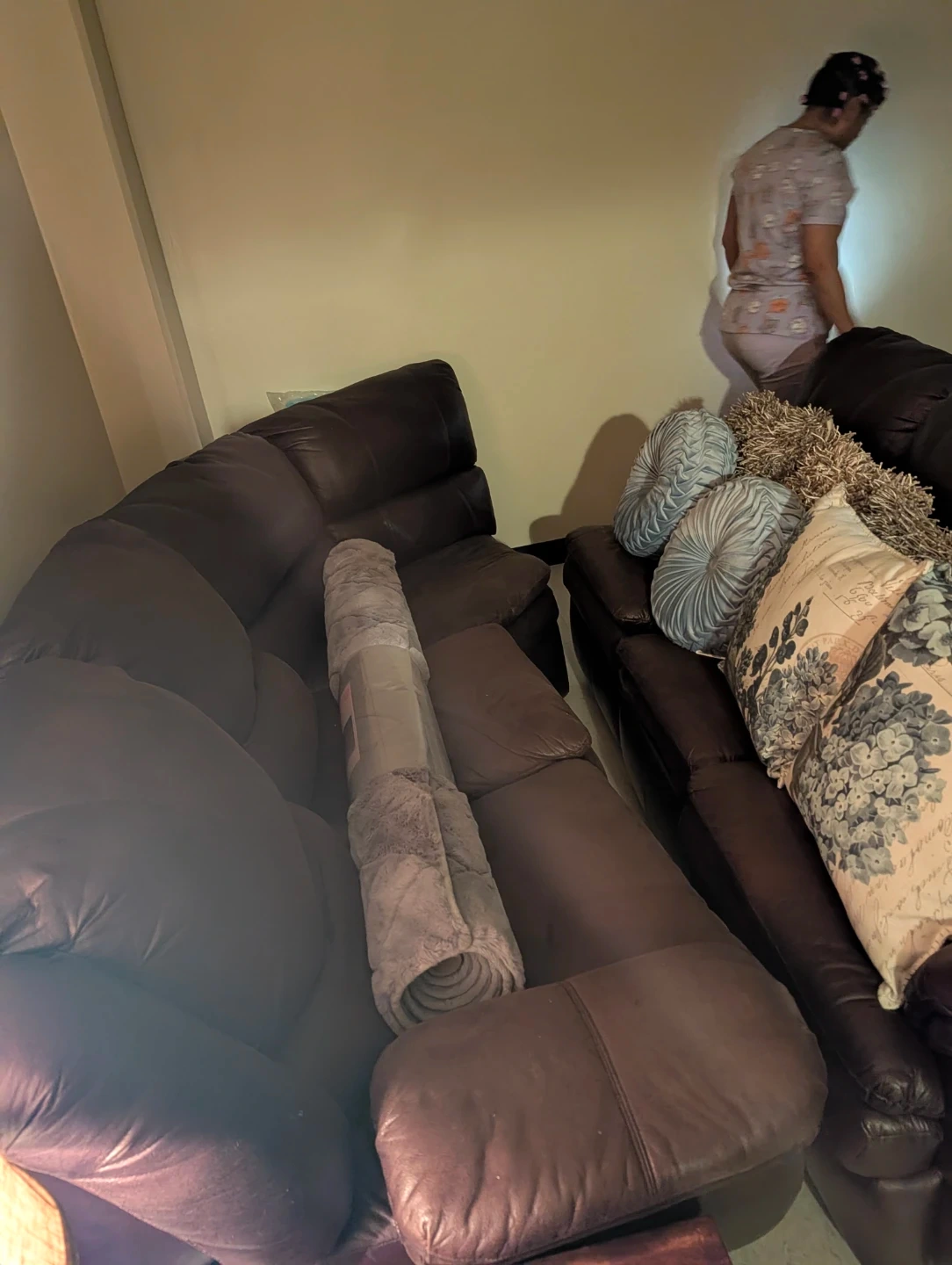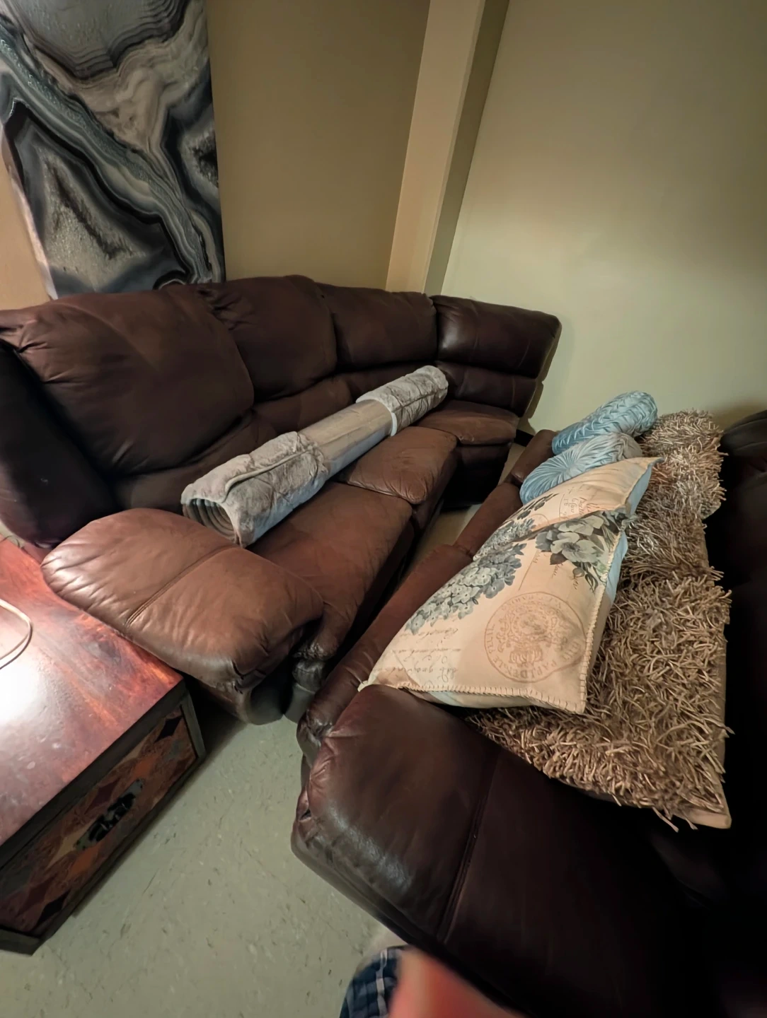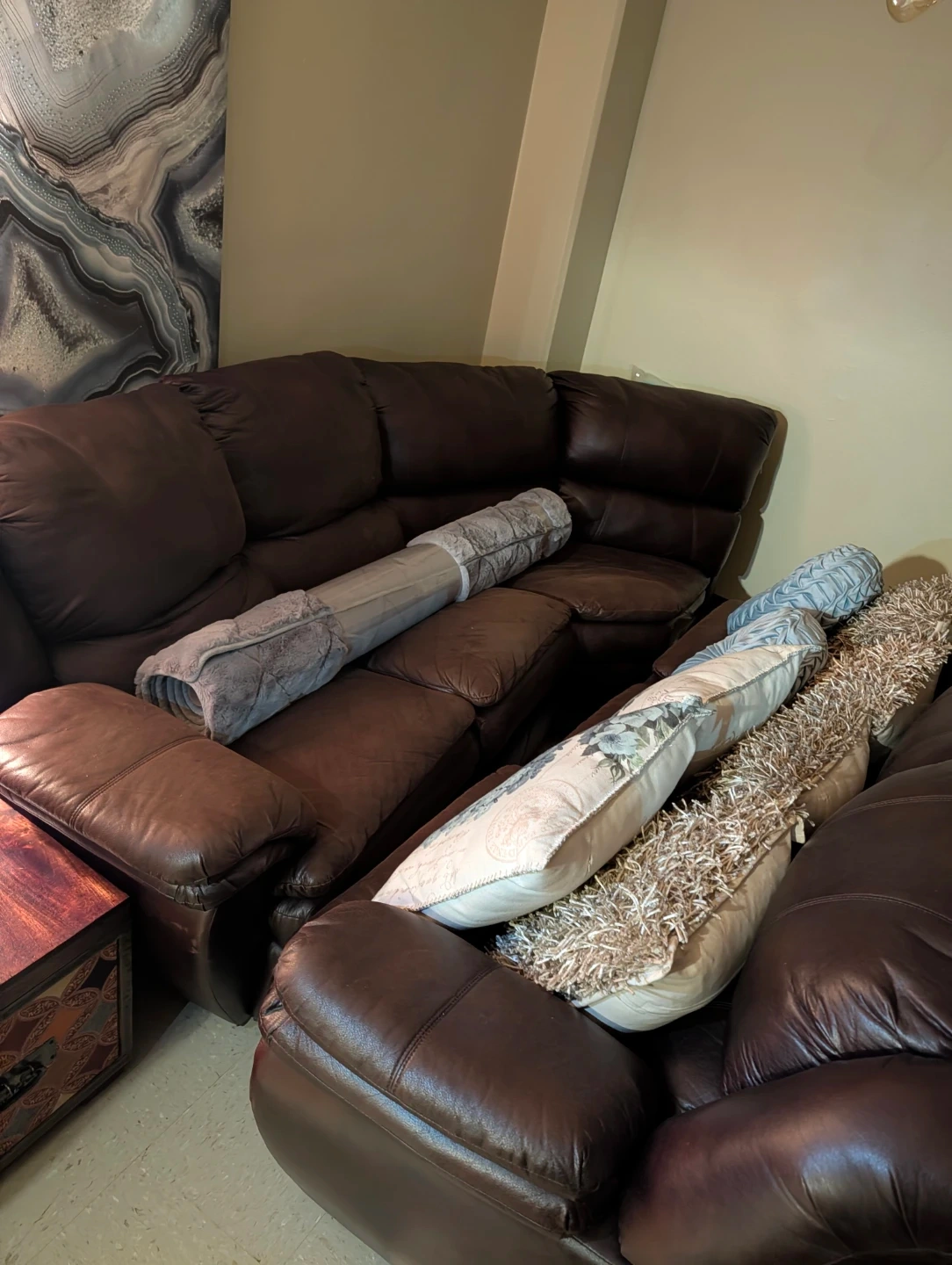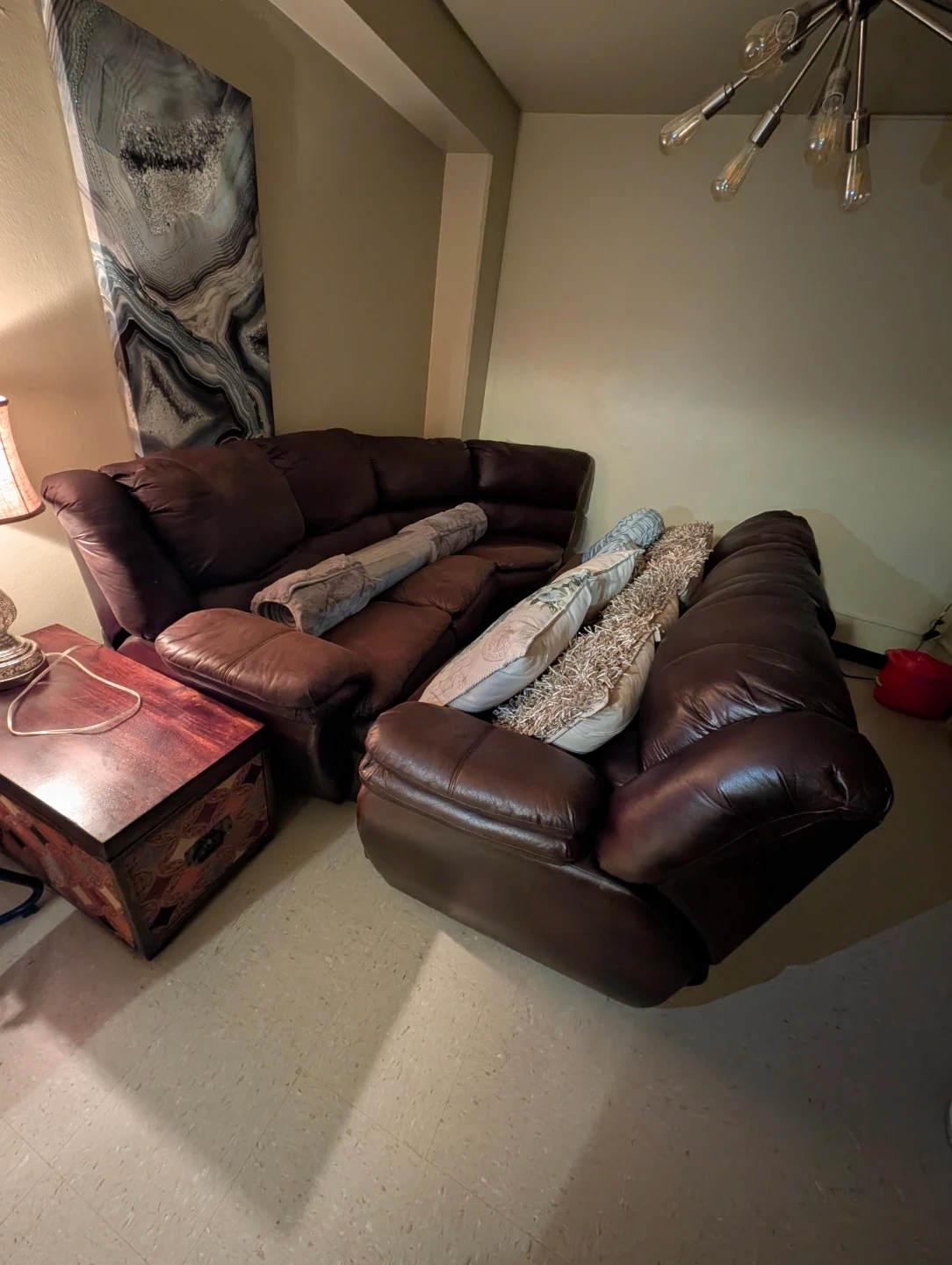 Selling a comfortable brown leather sectional sofa. It's in good condition and ready for a new home. Perfect for a living room or entertainment area. The leather is soft and the cushions are plush, making it a great place to relax
