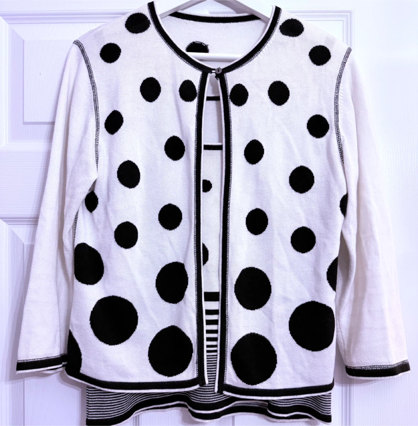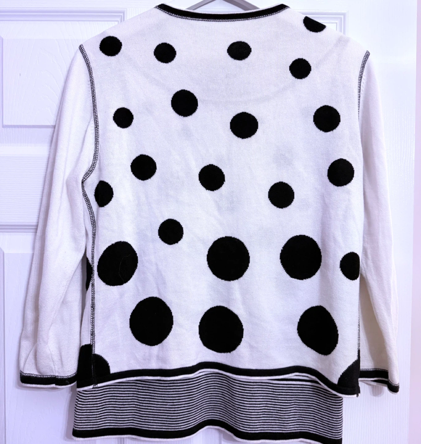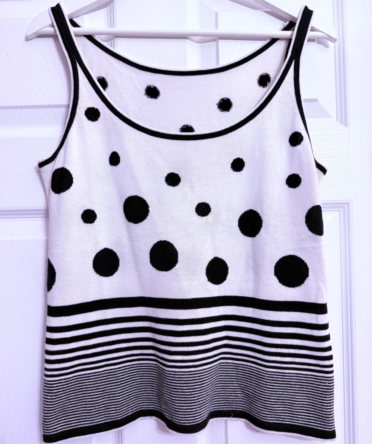 Selling an unbranded knit cardigan and tank set. The set is a white knit with black polka dots and stripes. It's a stylish and comfortable set that would be a great addition to any wardrobe!