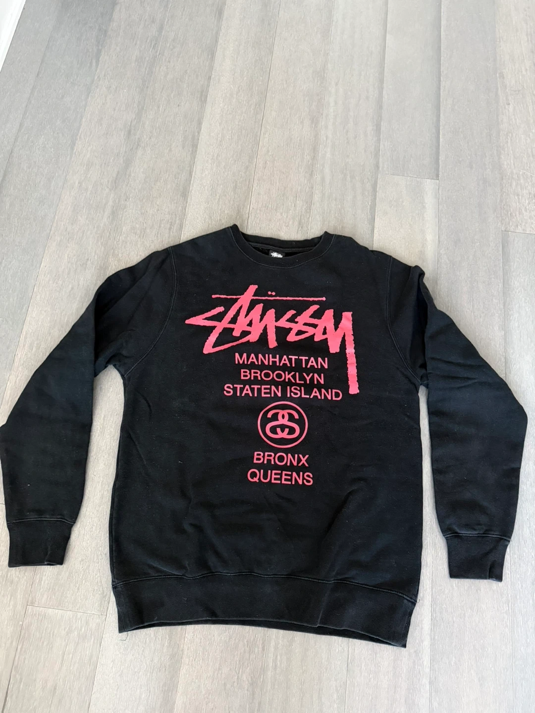Selling a black Stussy sweatshirt. The front has the Stussy logo in pink with Manhattan, Brooklyn, Staten Island, Bronx, and Queens printed below. The back has a larger Stussy logo in pink with Bed-Stuy, Washington Heights, Park Hill, Hunts Point, and Lefrak City printed below.