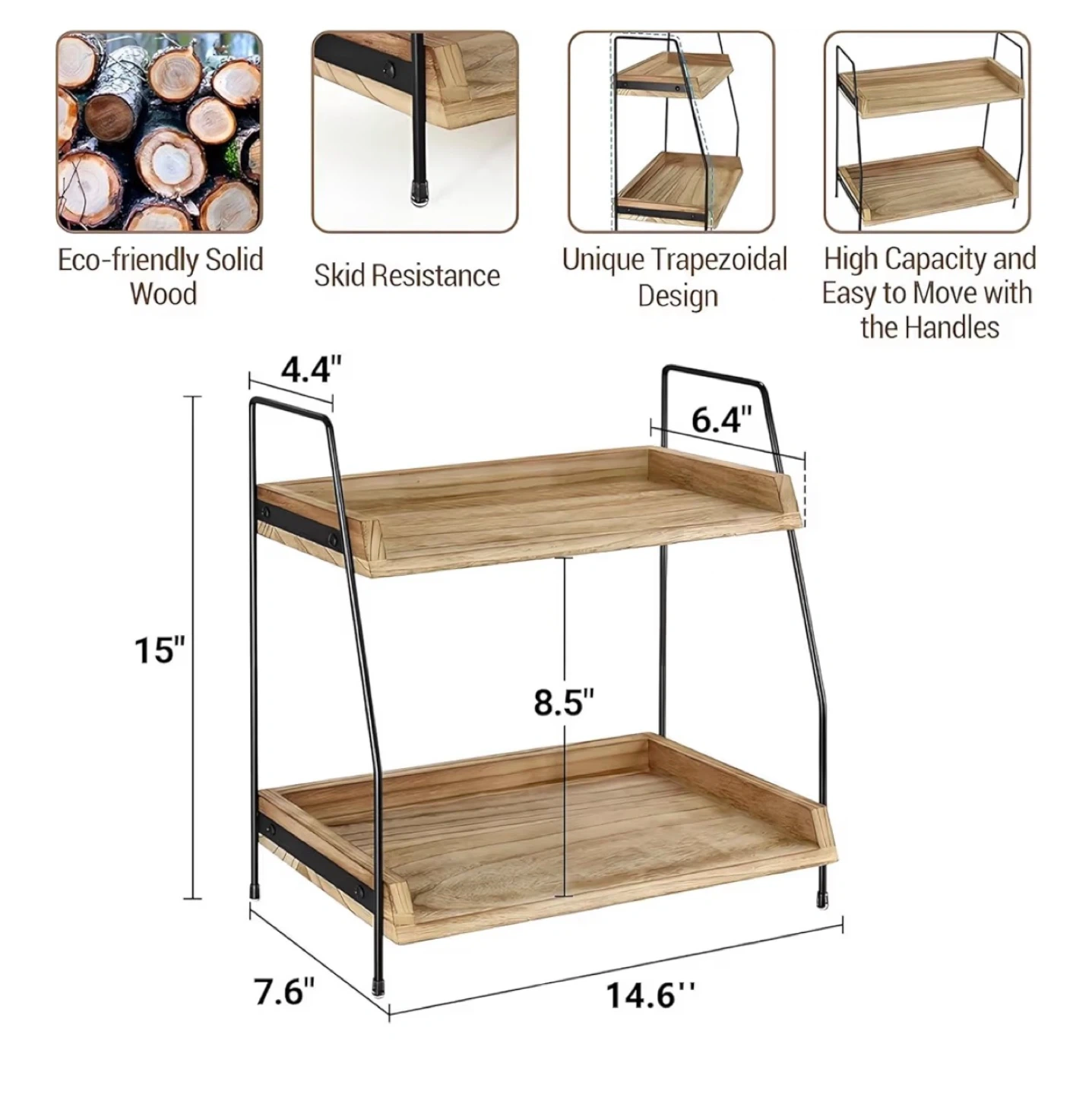 This 2-tier countertop shelf organizer is perfect for adding extra storage space to your bathroom, kitchen, or office. It's made of eco-friendly solid wood and has anti-slip rubber pads to prevent scratching. The unique trapezoidal design and handles make it easy to move around.