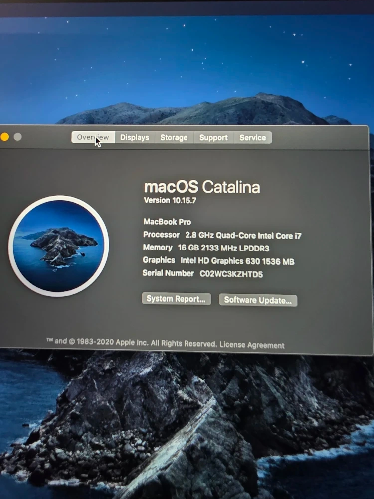 Selling a MacBook Pro running macOS Catalina Version 10.15.7. It has a 2.6 GHz Quad-Core Intel Core i7 processor, 16 GB of memory, and Intel HD Graphics 630 1536 MB. The serial number is C02WC3KZHTD5. It has 251 GB Flash Storage.