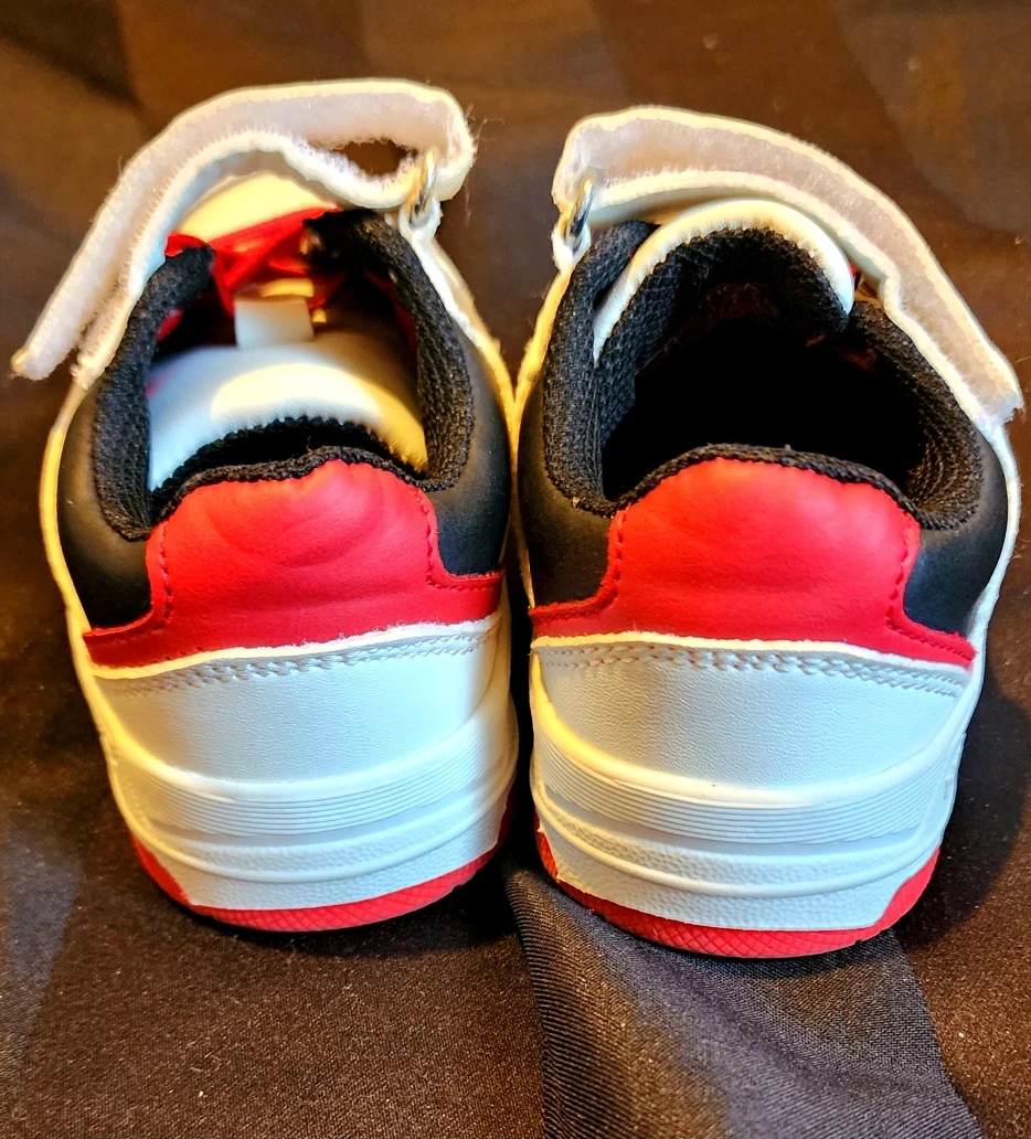 These are a pair of Nautica sneakers for babies in size 5. They feature a white, black, and red color combination, with red laces and a velcro closure. The soles are also red.
