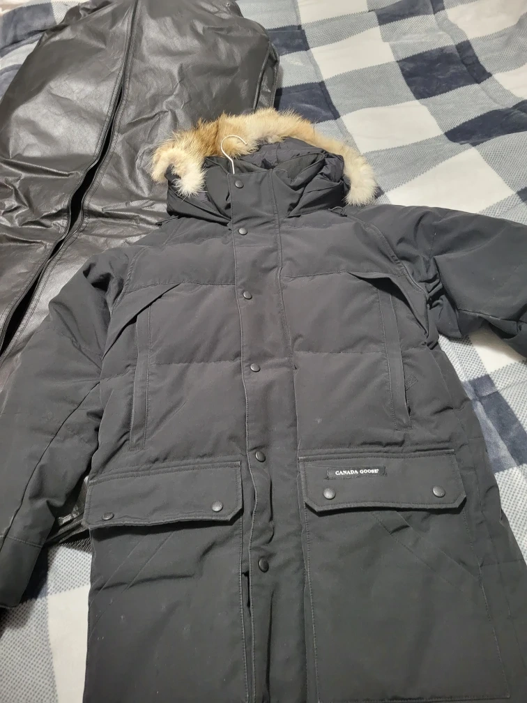 Selling a Canada Goose black down parka. It's in great condition and ready to keep you warm this winter! The parka features a fur-trimmed hood and multiple pockets for storage