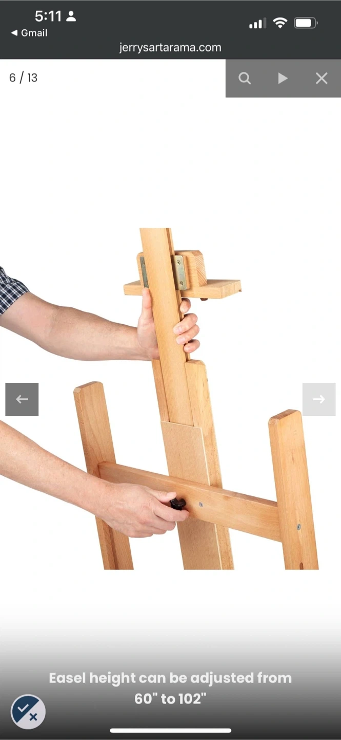 This is a Carolina Studio H-Frame Easel. It is handcrafted and made entirely from oiled beechwood. The easel height can be adjusted from 60" to 102". The sturdy quad base measures 22" wide x 24" deep. It also has a 22" utility shelf.