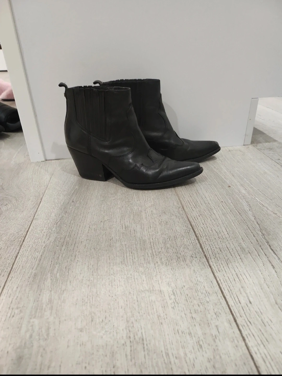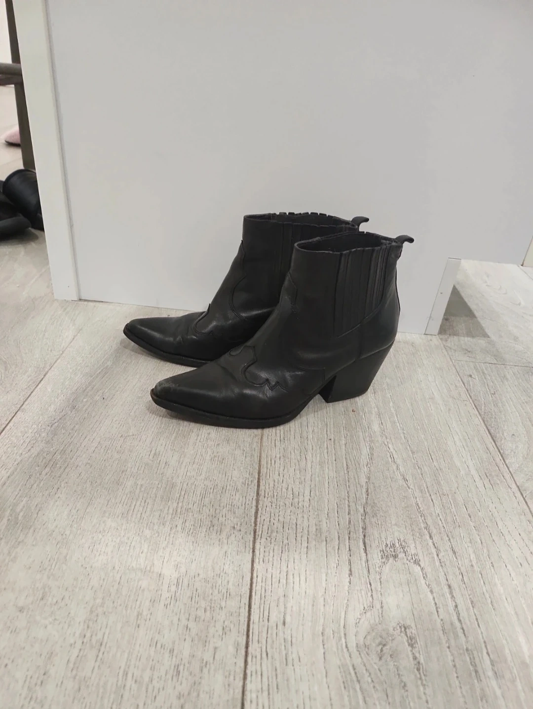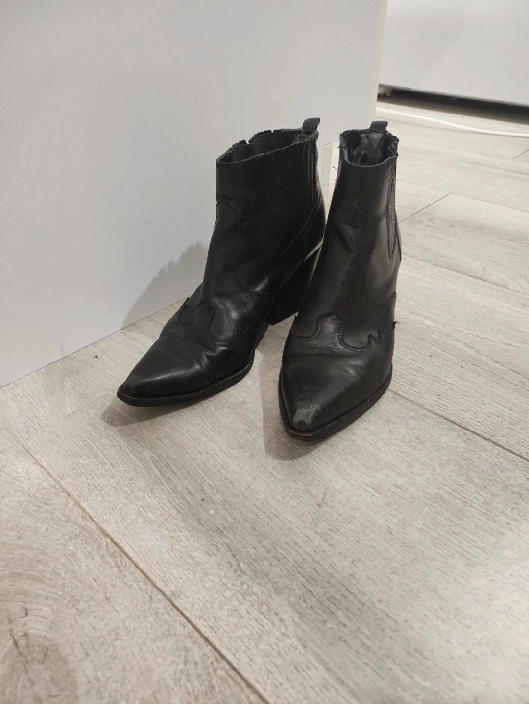 Selling a pair of black leather cowboy ankle boots. They show some signs of wear, as seen in the photos, but are still in good condition for everyday wear. These boots are a stylish addition to any outfit!