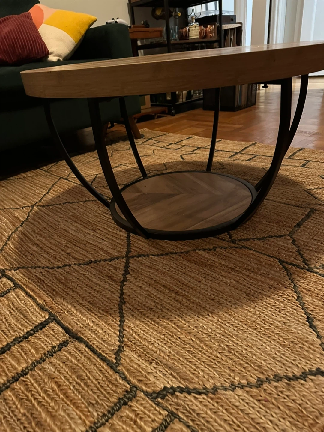 Selling a round wooden coffee table with a unique chevron pattern on top. The base is a sleek black metal. It's in great condition and would look great in any living room!