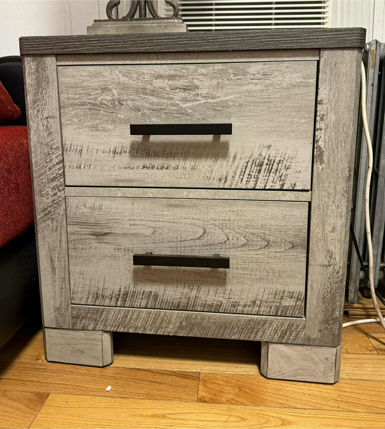 I'm selling a rustic gray nightstand/dresser. It features a weathered wood finish and black hardware, adding a touch of rustic charm to any room. Perfect for bedside storage or as an accent piece in your living space!