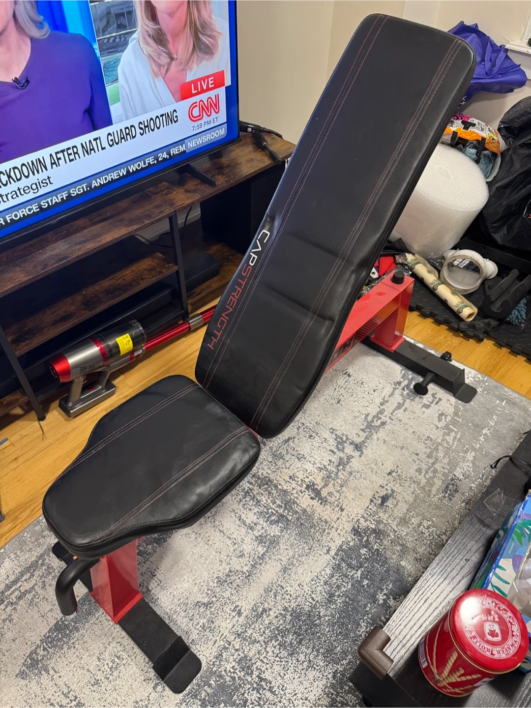 Selling a CAP Strength adjustable weight bench in good condition! It's perfect for home workouts and can be adjusted to different angles for various exercises. Great for anyone looking to build strength and stay fit!