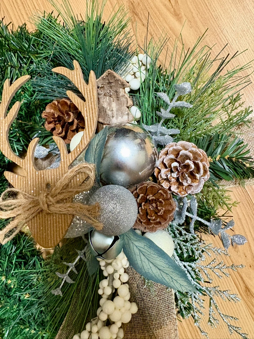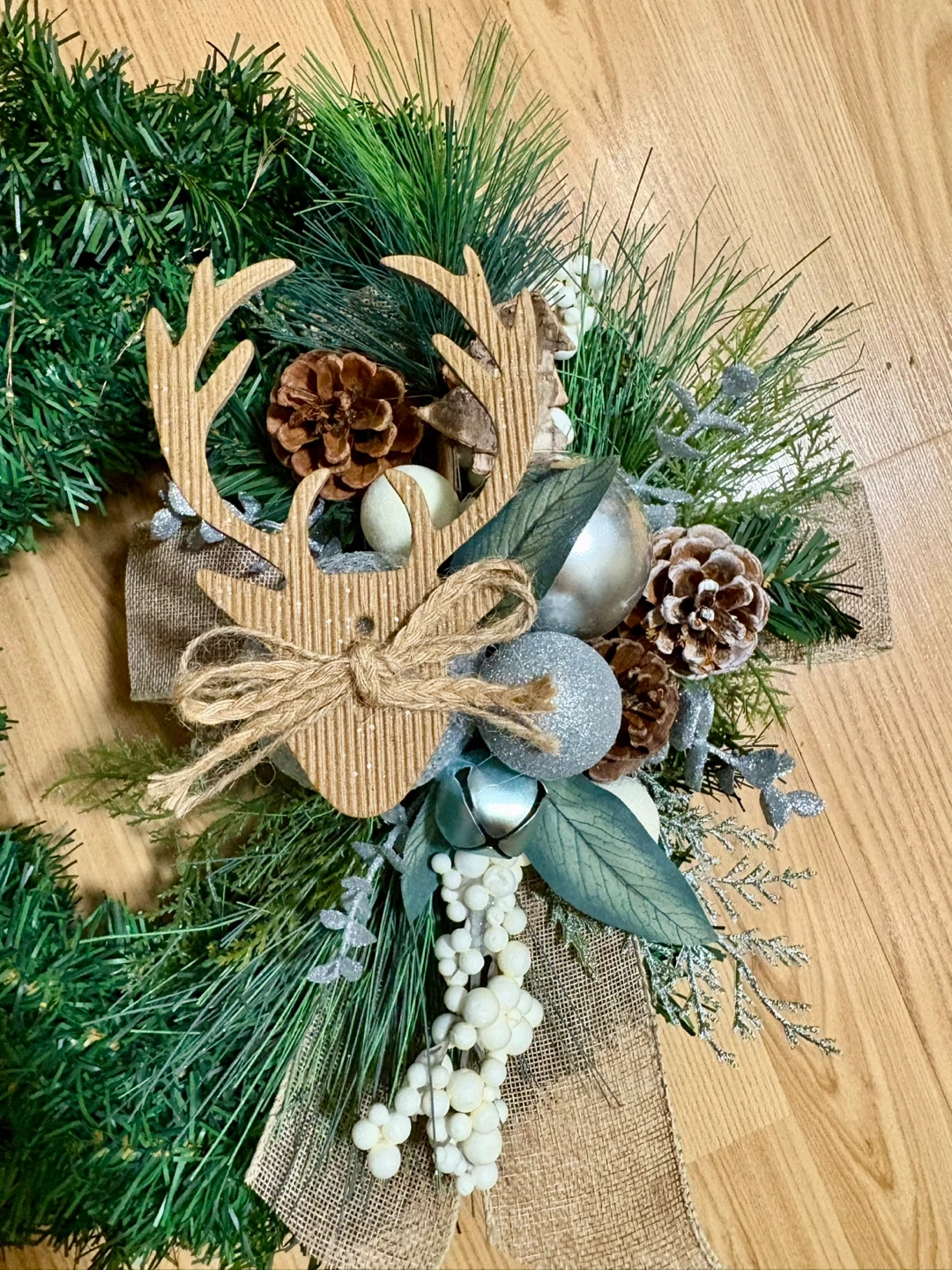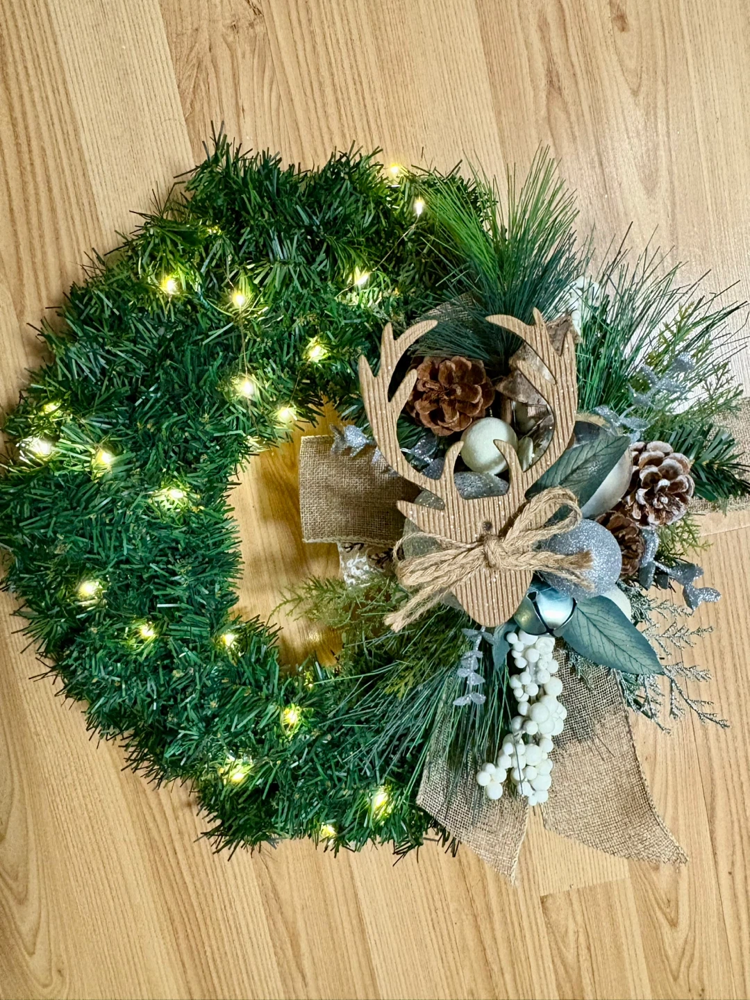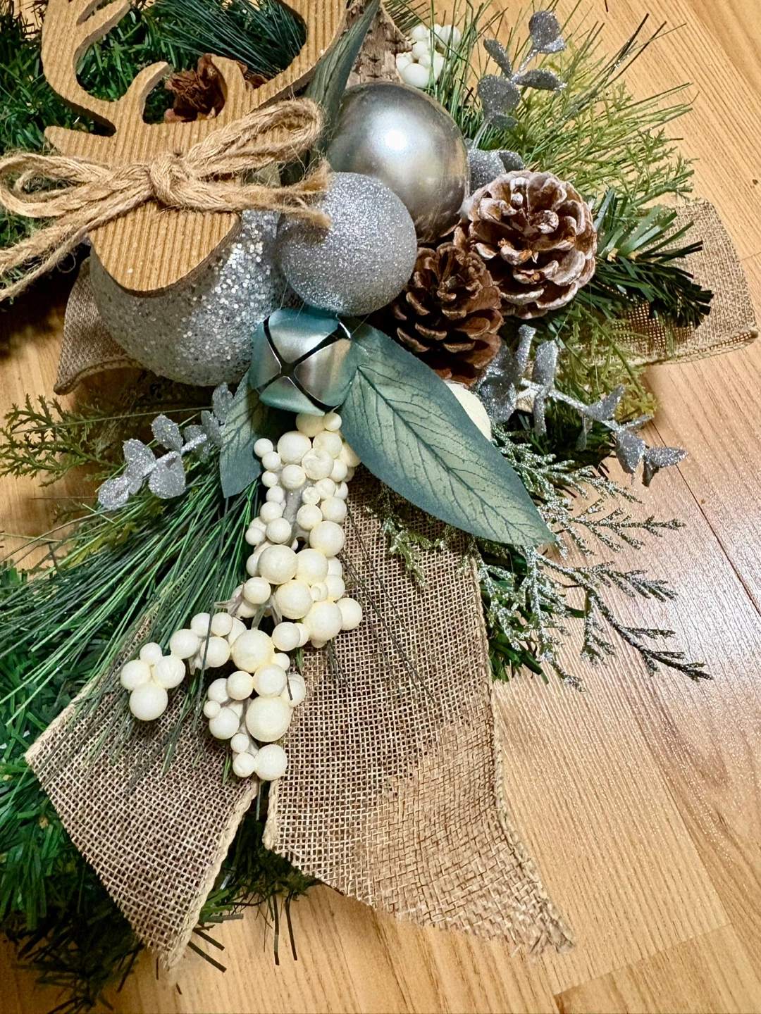 Festive Christmas wreath perfect for adding a touch of holiday cheer to your home! It features a reindeer decoration, pine cones, silver ornaments, battery operated lights and a burlap ribbon. Ready to hang and brighten up your space for the holidays