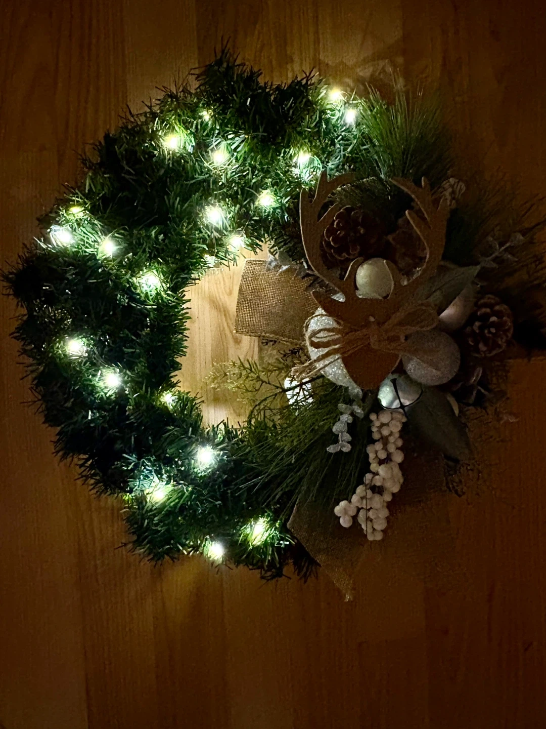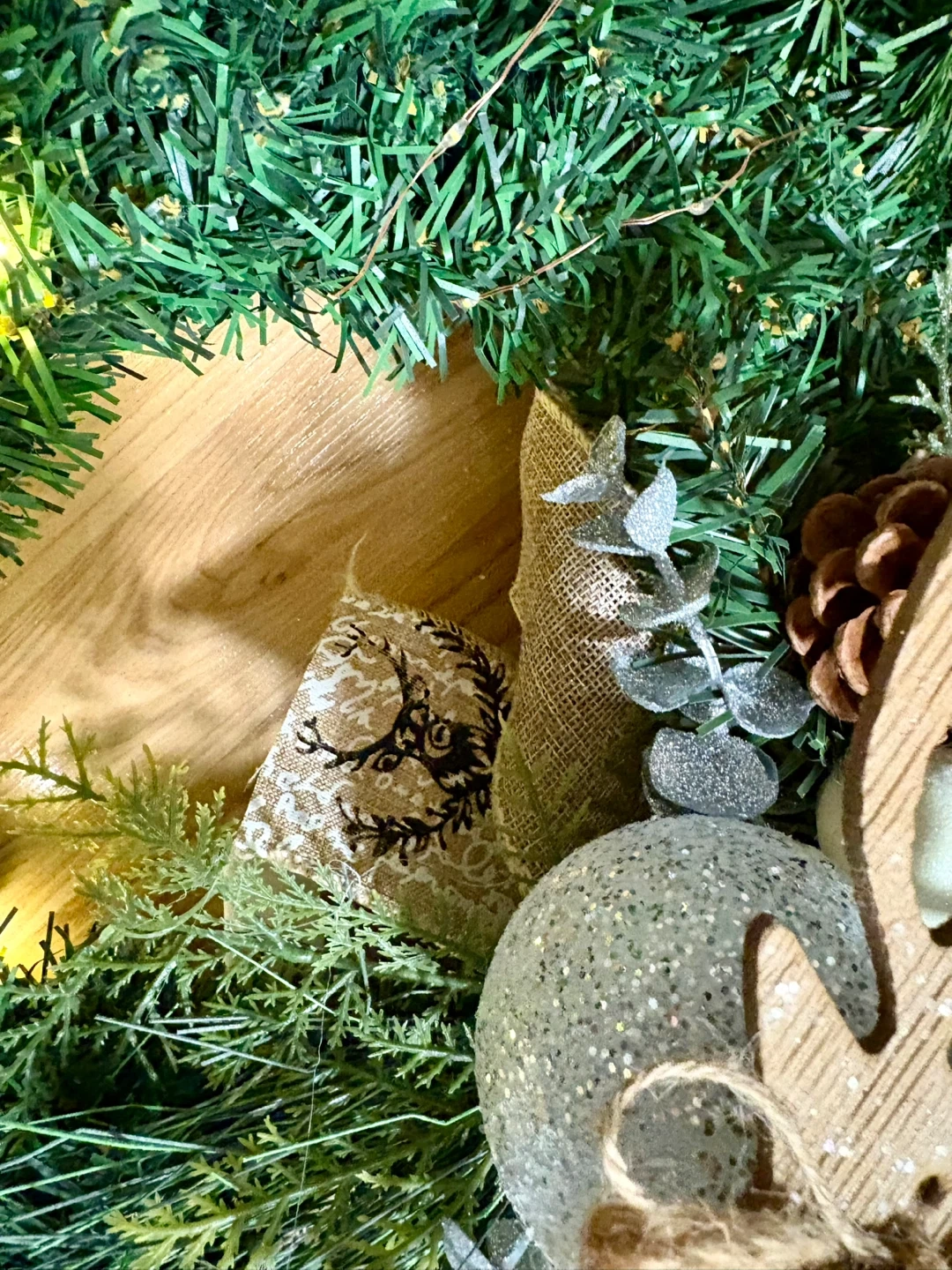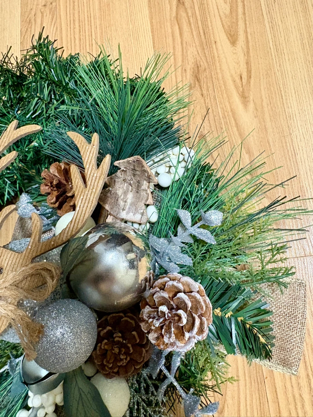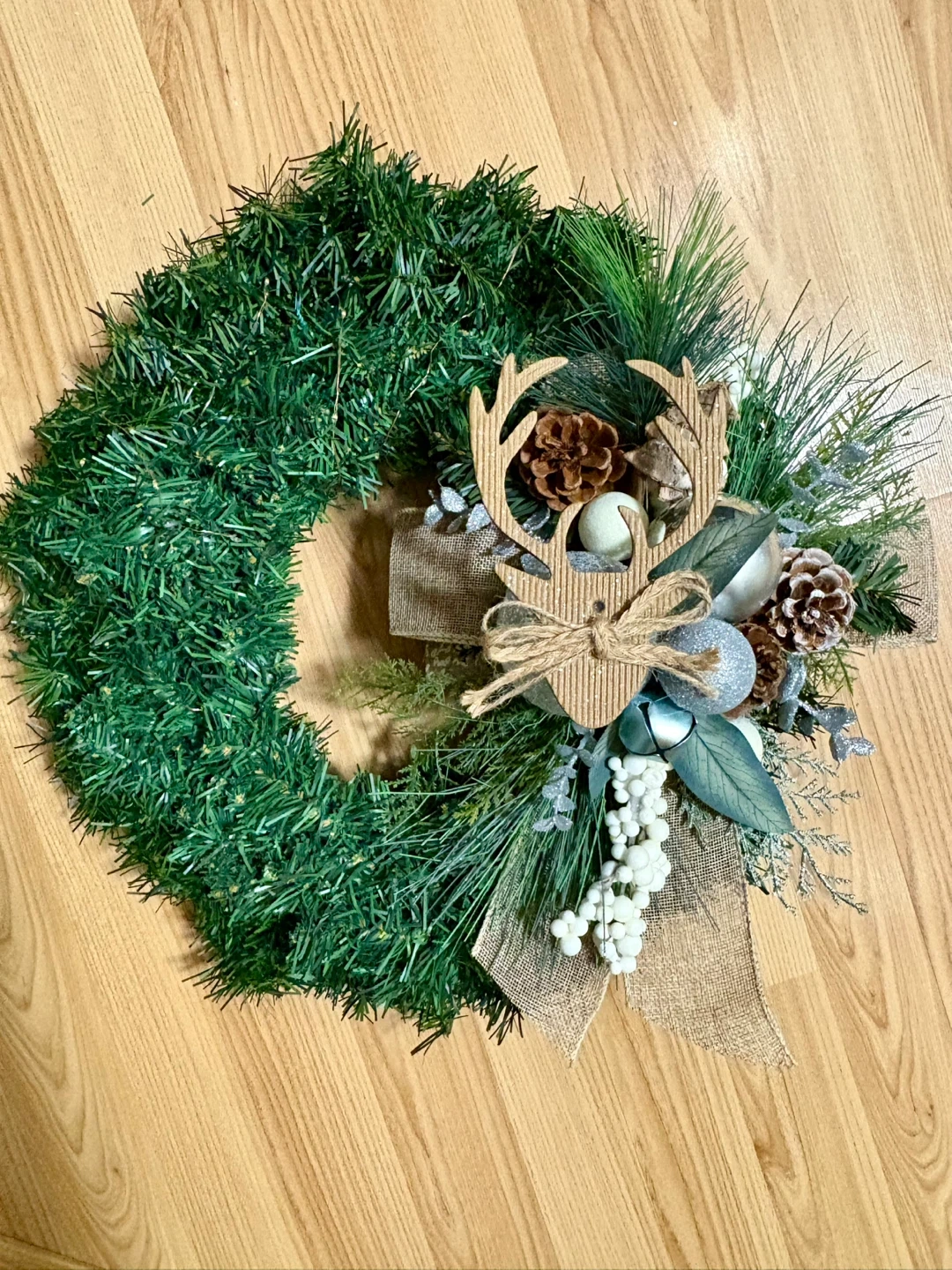 Festive Christmas wreath perfect for adding a touch of holiday cheer to your home! It features a reindeer decoration, pine cones, silver ornaments, battery operated lights and a burlap ribbon. Ready to hang and brighten up your space for the holidays