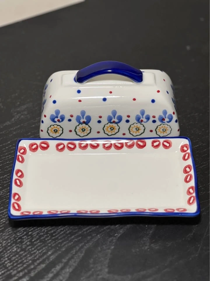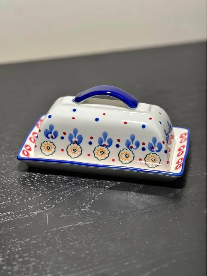 This butter dish is the Gypsy Signature pattern Polish Pottery butter dish, featuring a red, burgundy, and blue floral and dots design. The piece is expertly hand-painted and handcrafted reflecting traditional ceramic methods.