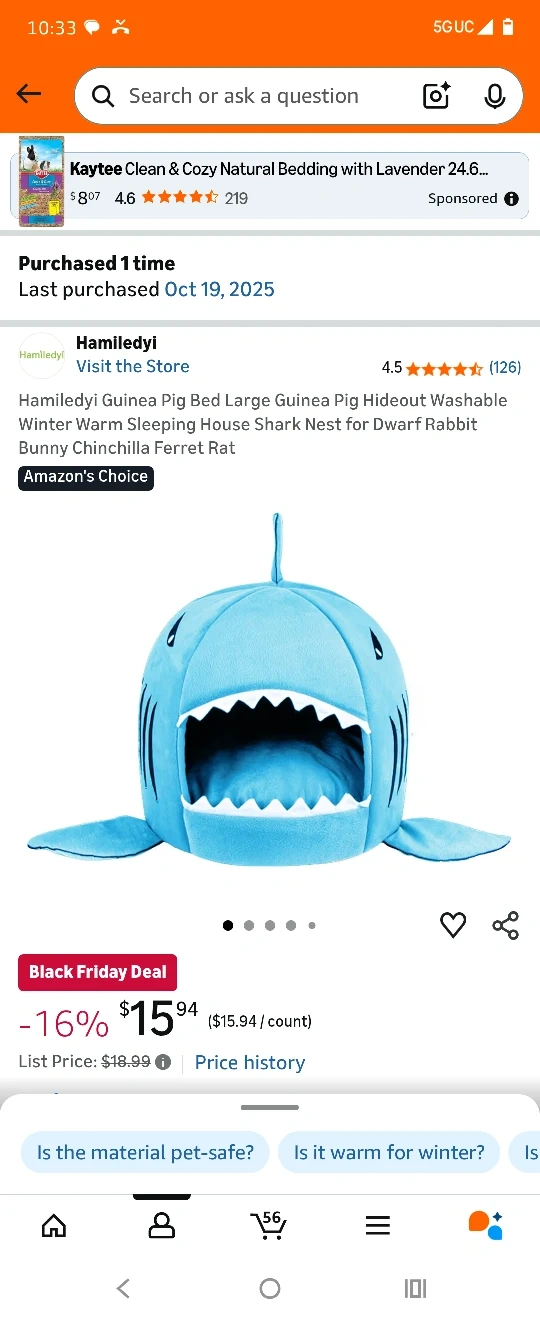 Selling a cute Hamiledyi guinea pig bed! It's a large, washable, winter-warm sleeping house shaped like a shark. Perfect hideout for dwarf rabbits, bunnies, chinchillas, and ferrets. The list price was $18.99.