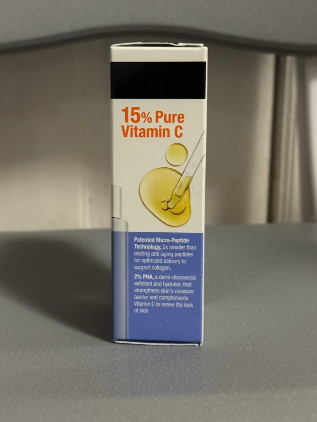 -I'm selling a Kenvue 15% Pure Vitamin C. This formula is fragrance-free, paraben-free, and dye-free. It's also dermatologist-tested, non-comedogenic, and allergy-tested. It contains patented micro-peptide technology that is 2x smaller than leading peptides for optimized delivery to support collagen. Also contains 2% PHA, a derm-discovered exfoliant and hydrator, that strengthens skin's moisture barrier and complements Vitamin C to renew the look of skin