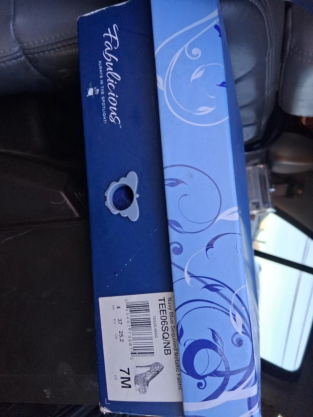Selling a pair of Fabulicious heels, model TEE06SQ/NB, in navy blue sequined metallic fabric. The size is 7M. Comes with the original box!
