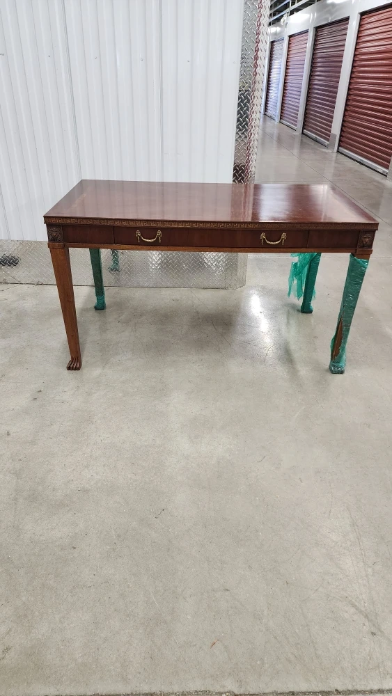 Here's a lovely wooden desk with unique lion carvings on the legs and decorative trim along the top. It has a beautiful wood grain pattern and brass-coloured drawer pulls. The legs are currently wrapped for protection during transport.