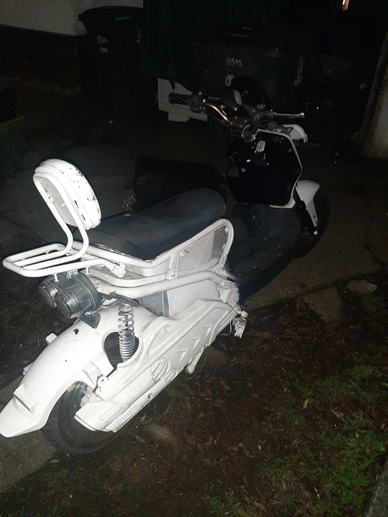 Selling a white electric scooter. It has a black seat and a front headlight. It shows signs of wear and tear.