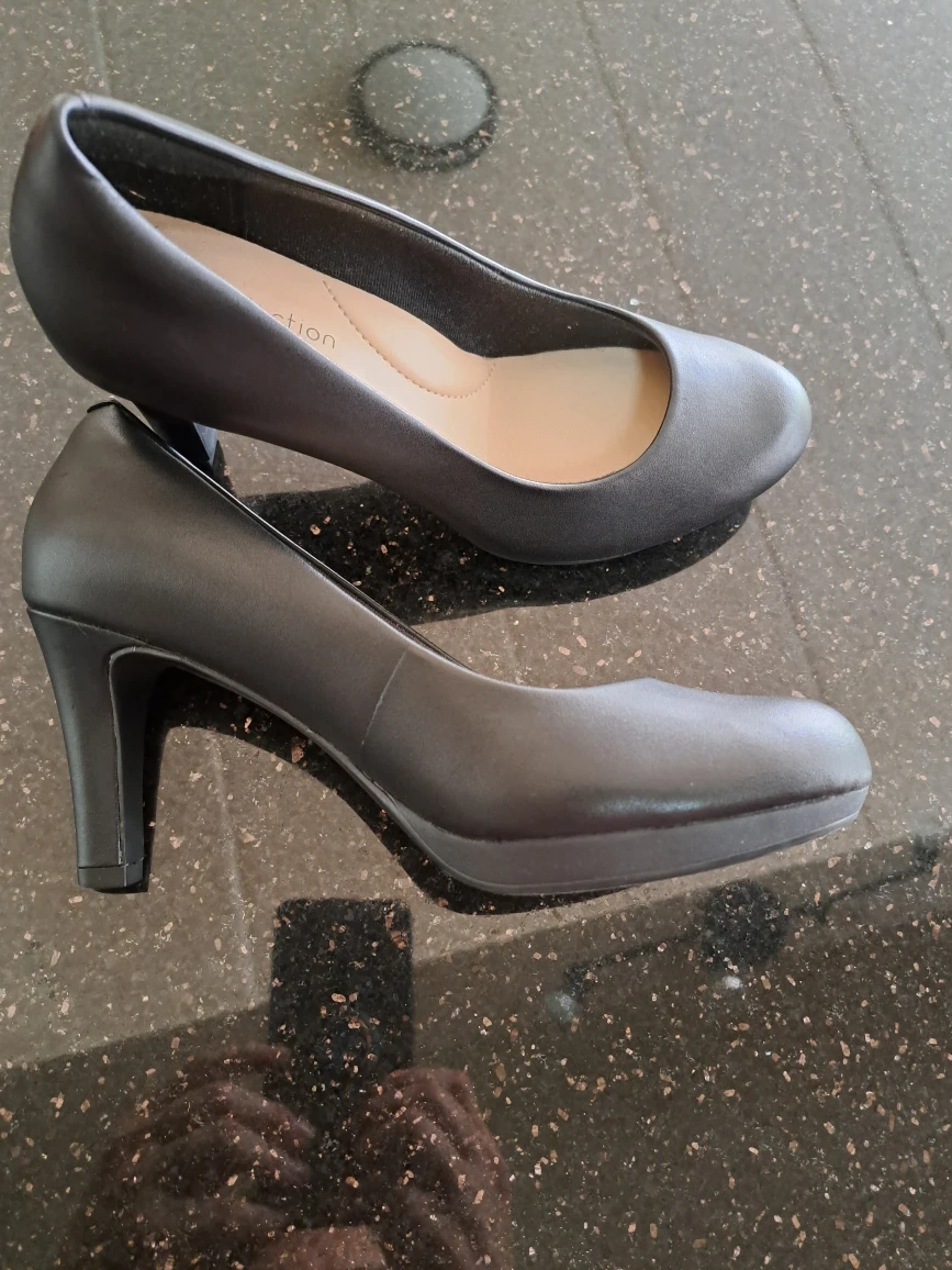 Selling a pair of Clarks Collection heels in black leather. They are in good condition and ready for a new owner. These heels are a classic style that can be dressed up or down! Girl