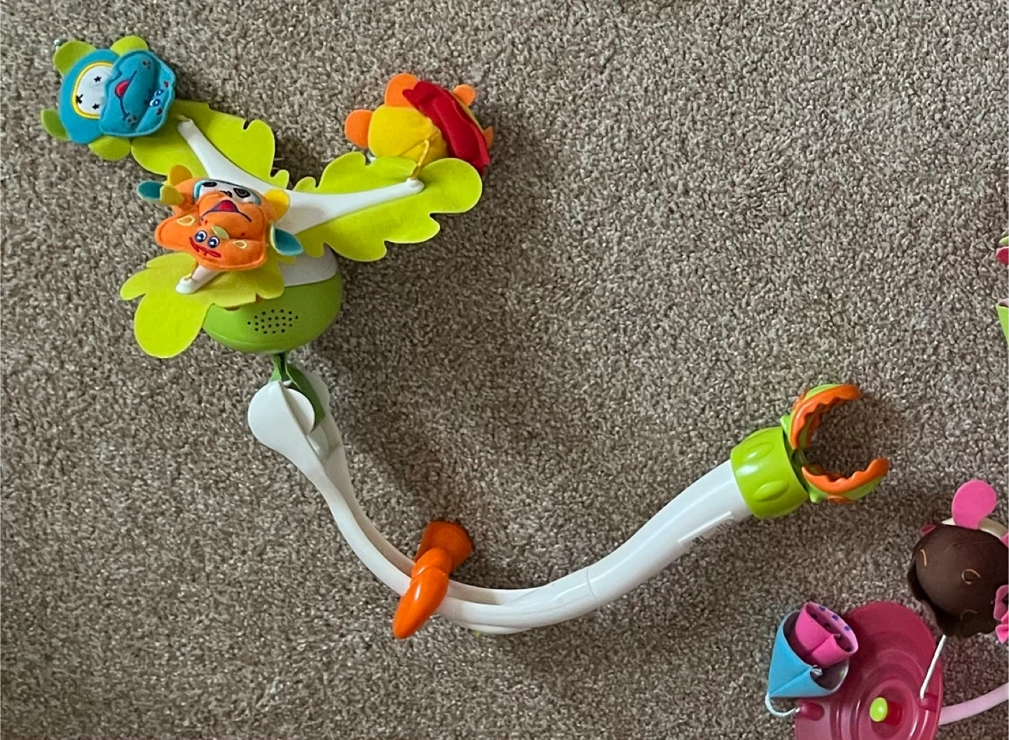 This Tiny Love Take-Along Mobile easily attaches to car seats, strollers, and bassinets for on-the-go fun. It also plays five different melodies to help soothe and entertain your baby