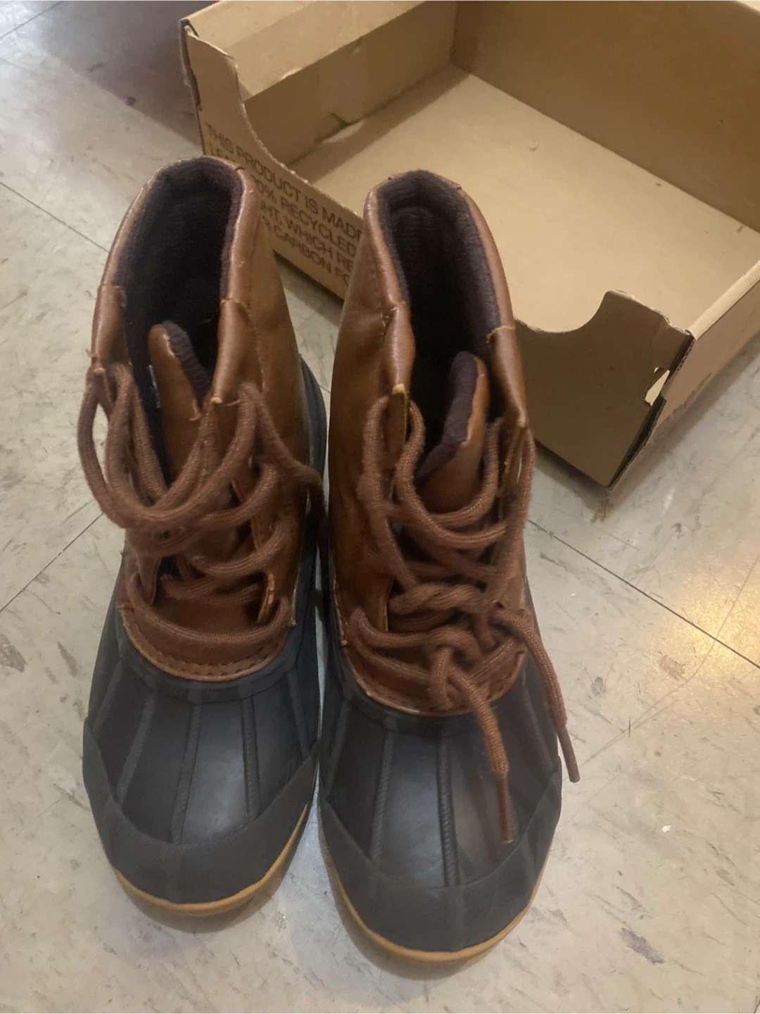 Selling a pair of Sperry duck boots in size 13M. They're in great shape and come with the original box. The boots feature a brown upper and a black rubber lower. Perfect for keeping your feet dry and stylish!