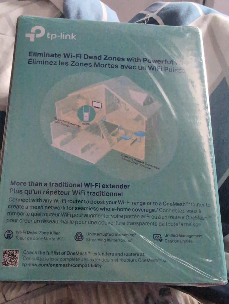Selling a brand new TP-Link RE315 AC1200 Dual-Band WiFi Mesh Extender! It's still in its original packaging. This extender helps eliminate Wi-Fi dead zones with powerful WiFi. It works with any Wi-Fi router to boost your Wi-Fi range or to a OneMesh router to create a mesh network for seamless whole-home coverage. It also features uninterrupted streaming and easy setup via the Tether app